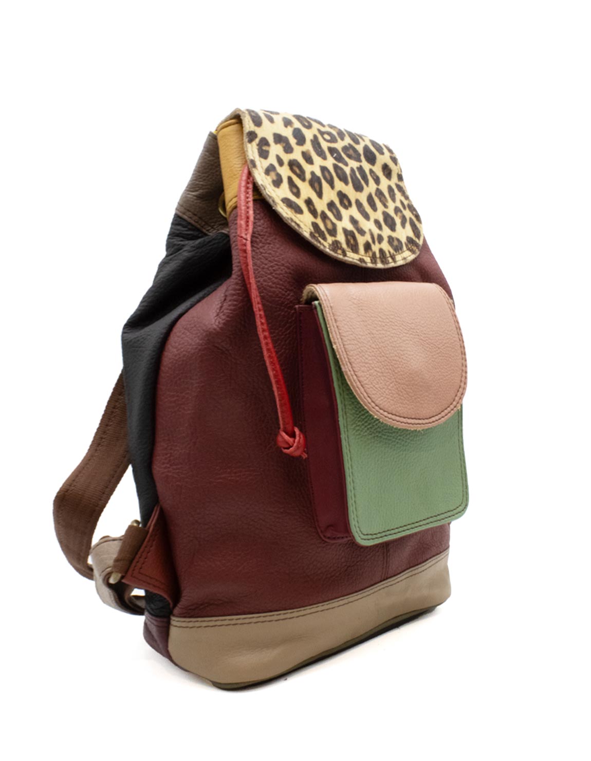 100% Upcycled Leather Backpack. Multicolor Eco-friendly Handmade Backpack with animal print flap and in Shades of Red and Bright Colors.