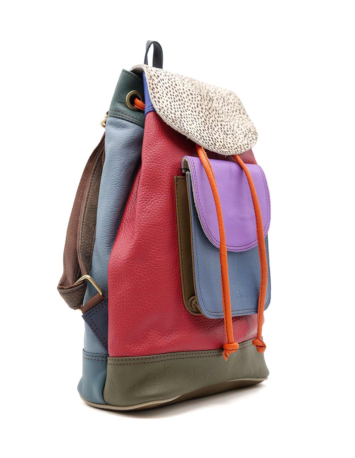 100% Upcycled Leather Backpack. Multicolor Eco-friendly Handmade Backpack with animal print flap and in Shades of Red and Bright Colors.