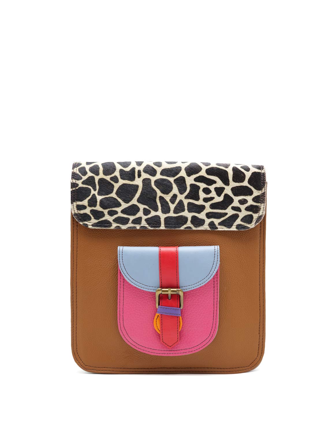100% Upcycled Leather Backpack. Multicolor Eco-friendly Handmade Backpack in Shades of Brown, Bright Colors and with Animal print flap.