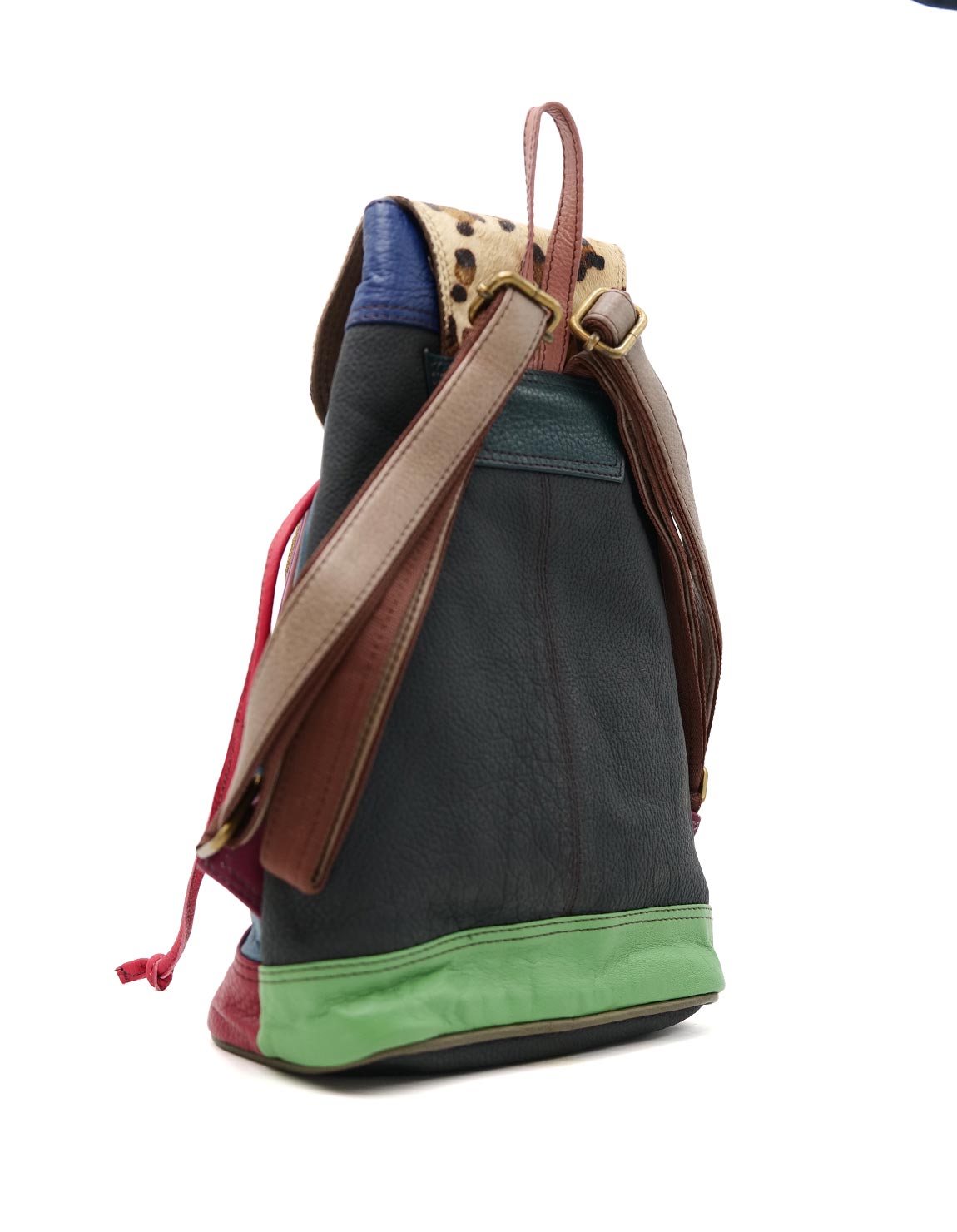 Motxilla de pell 100% reciclada. Motxilla ecològica multicolor feta a mà amb solapa d’estampat animal en tons blaus i colors brillants.