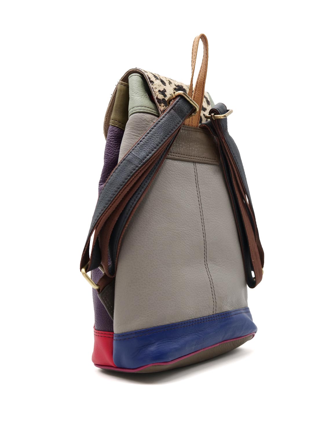 Motxilla de pell 100% reciclada. Motxilla ecològica multicolor feta a mà amb solapa d’estampat animal en tons porpra i colors brillants.