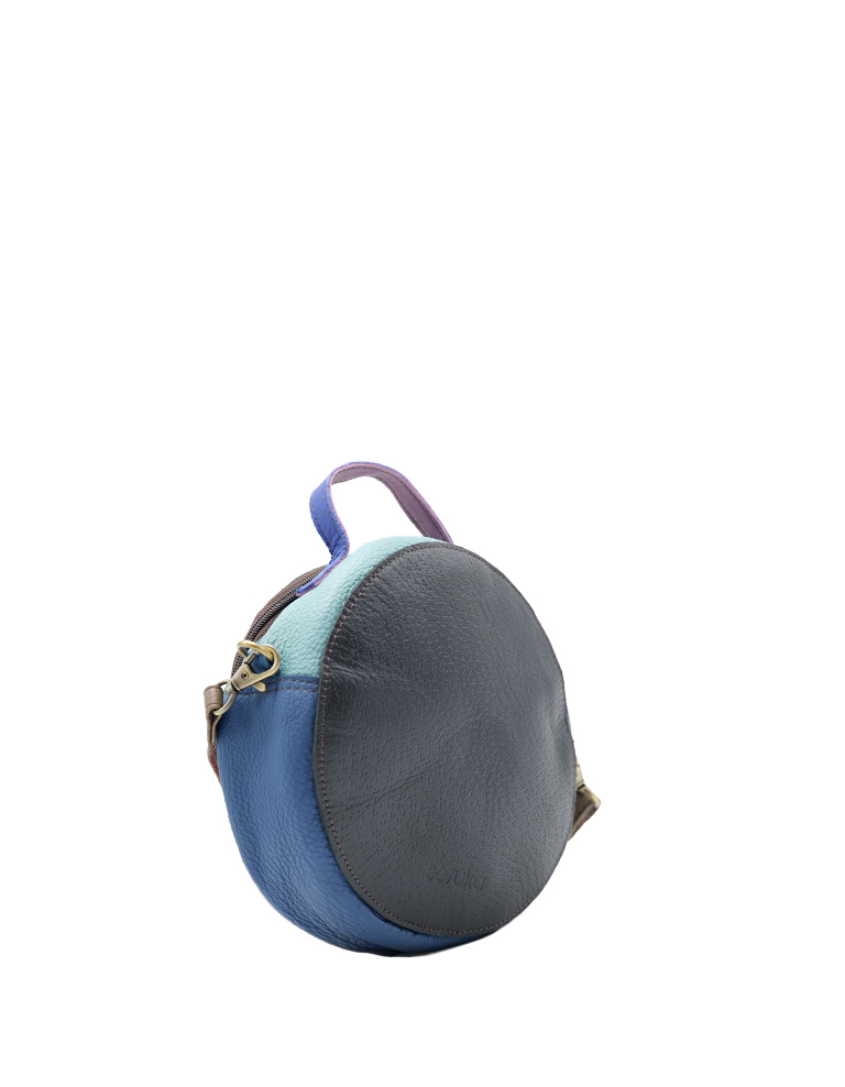 Preciós bossa rodó de pell 100% reciclada que causarà sensació quan el portis posat i afegirà un toc de glamour al teu look. Bossa ecològica feta a mà en tons blaus i vermells.