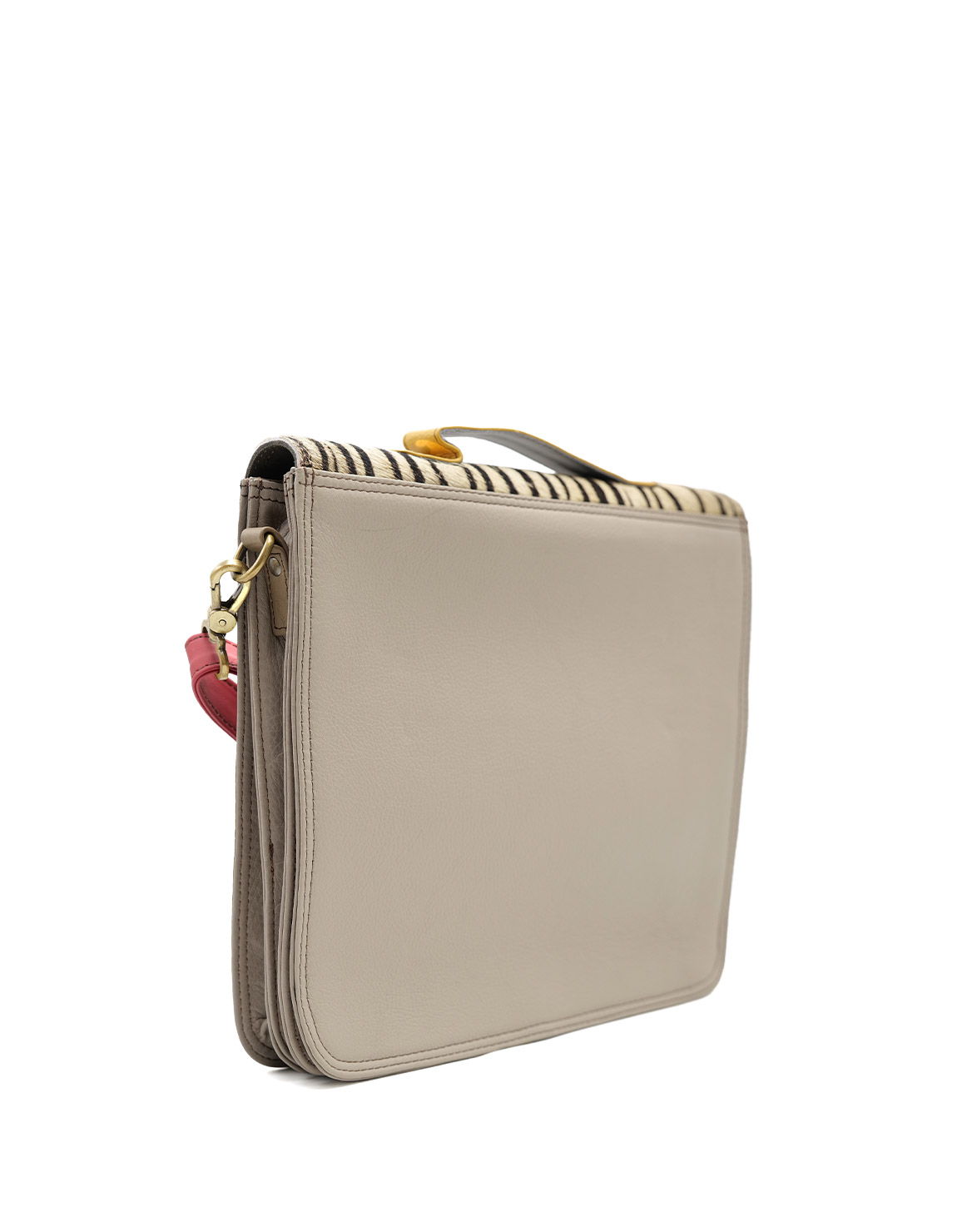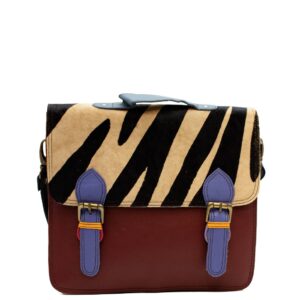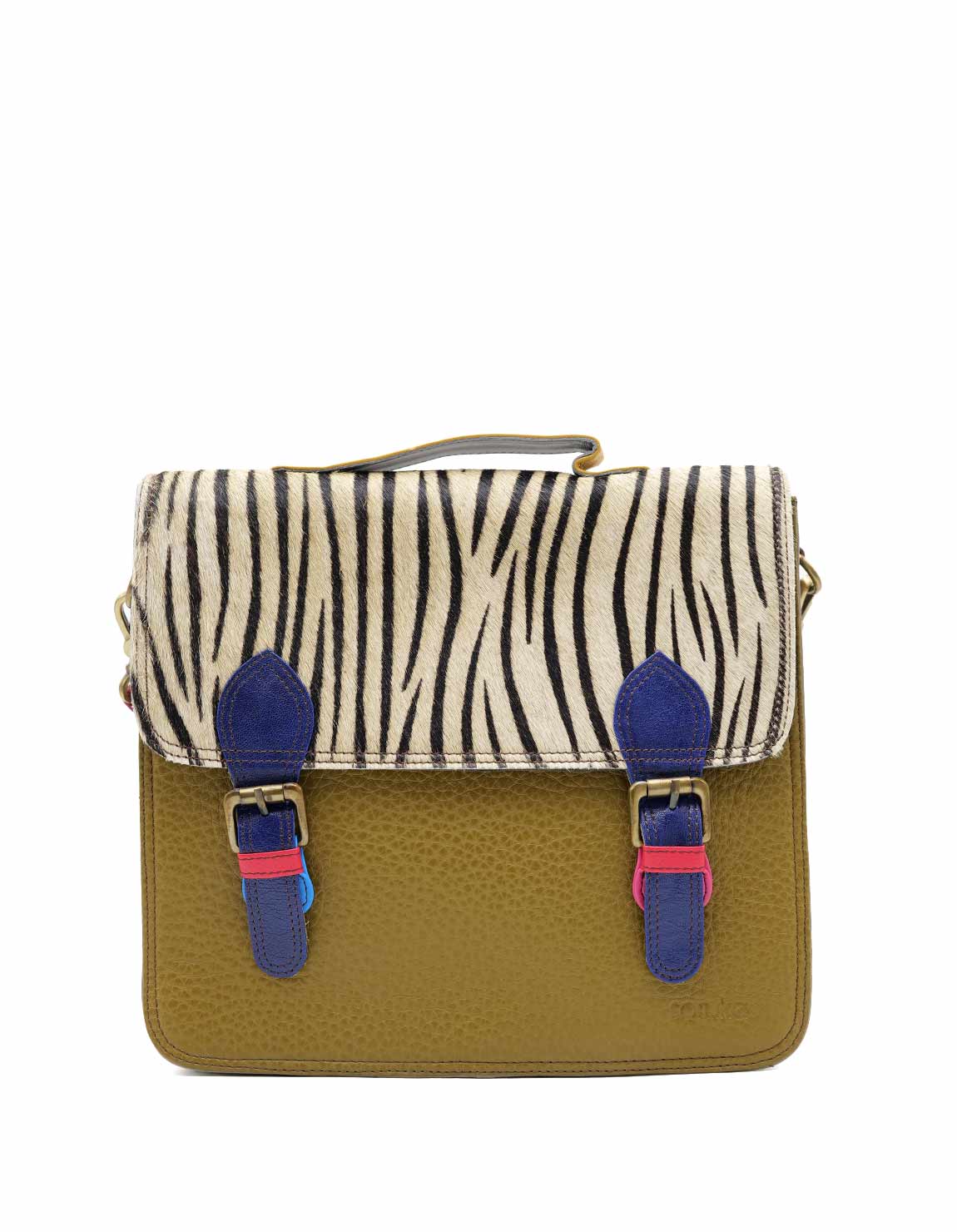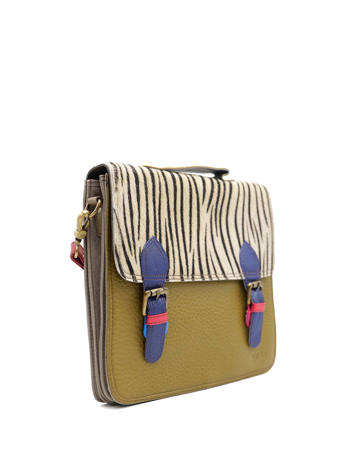 Maletí de pell 100% reciclada en tons verds i solapa amb estampat animal. Bossa de missatgeria feta a mà ecològica amb mànec superior.
