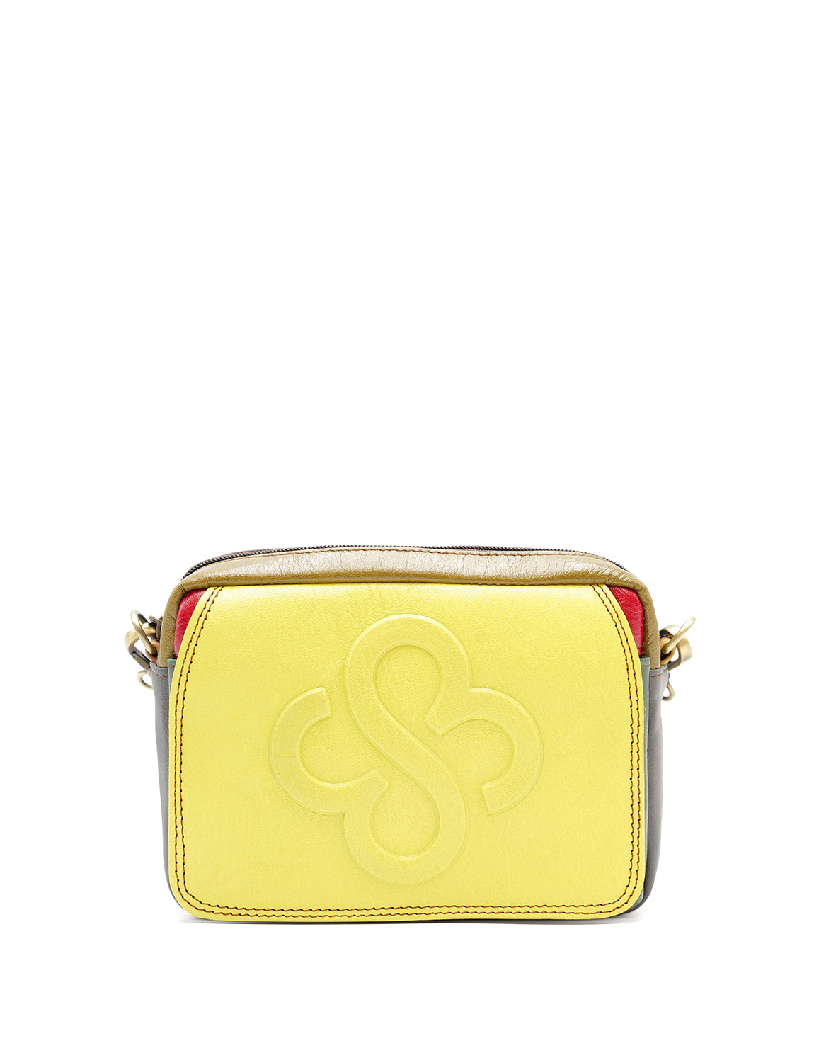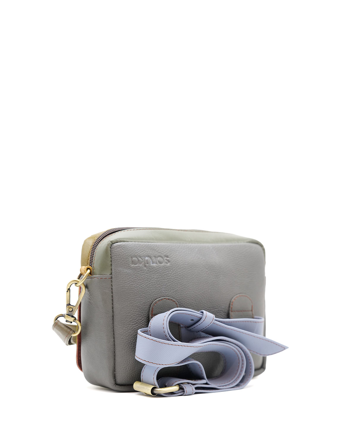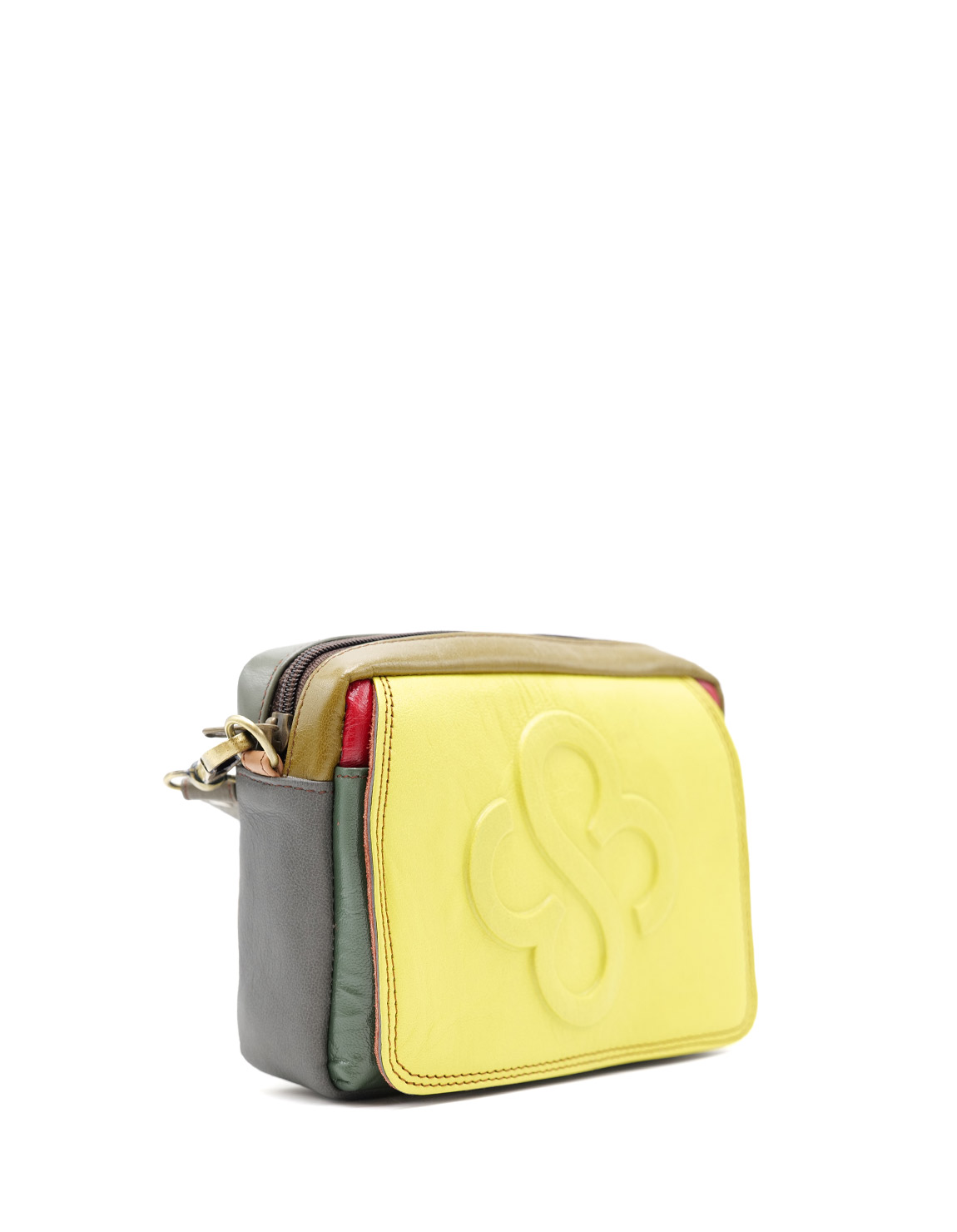 Preciósa Bossa de Pell 100% Reciclada. Bossa ecològica feta a mà en tons verds i grocs. Aquesta petita i colorida bossa és única i complementa tot tipus de looks. Té una corretja llarga ajustable que permet portar-lo com a bandolera o creuat. El compartiment principal es tanca amb una cremallera, a més té un segon compartiment sota la solapa que es corda amb un tancament magnètic.