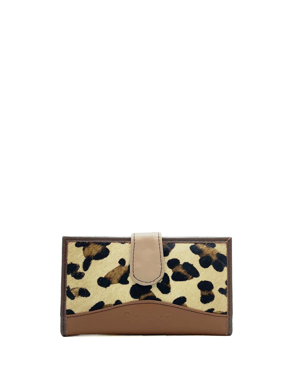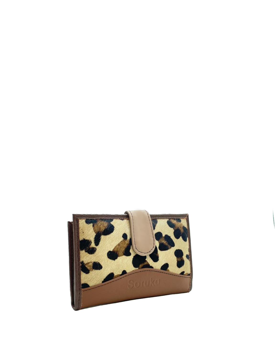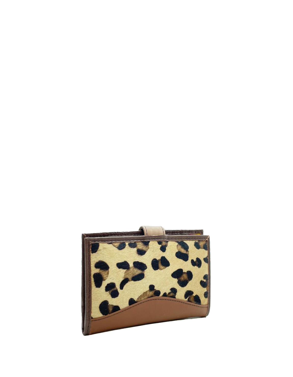 Cartera artesanal en pell reciclada marró i estampat animal. Preciosa cartera ecològica feta amb pell reciclada.
