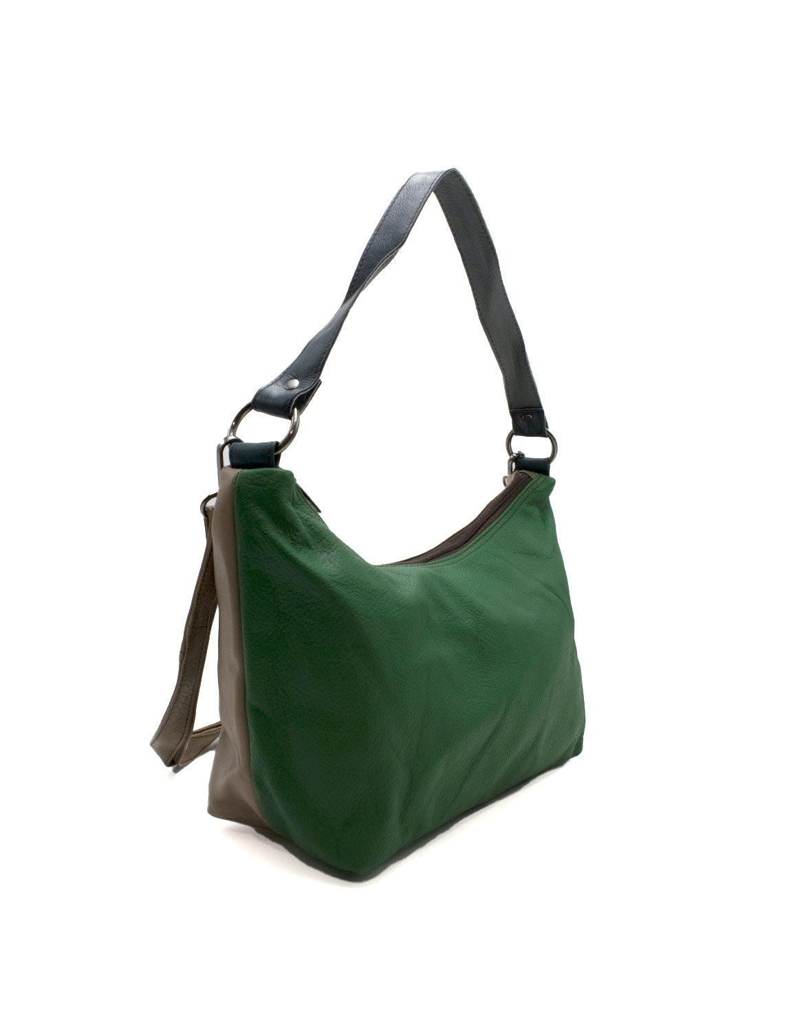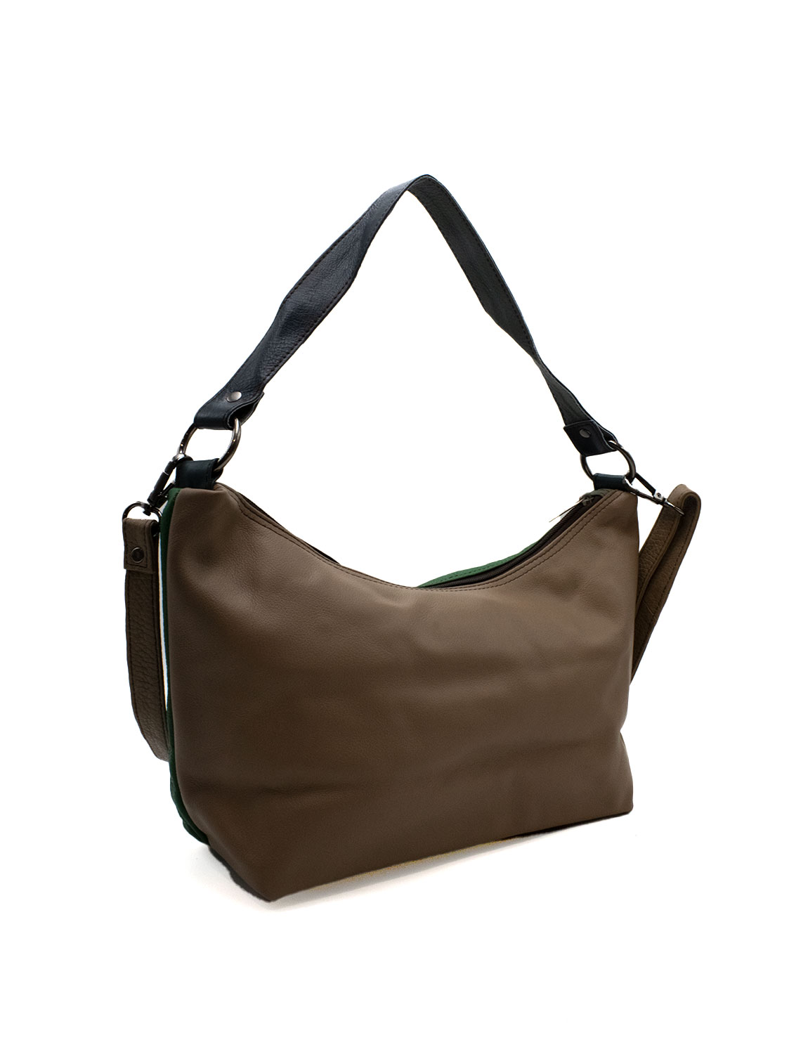 Umhängetasche mit Hobo-Style aus 100% recyceltem Leder. Genießen Sie zwei Looks in einer Tasche: eine Seite in Brauntönen und die andere in grün. Schöne handgefertigte umweltfreundliche Tasche.