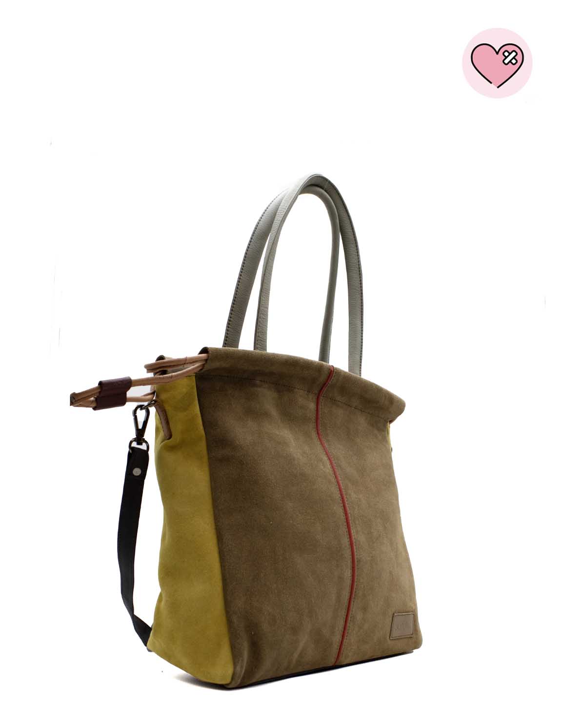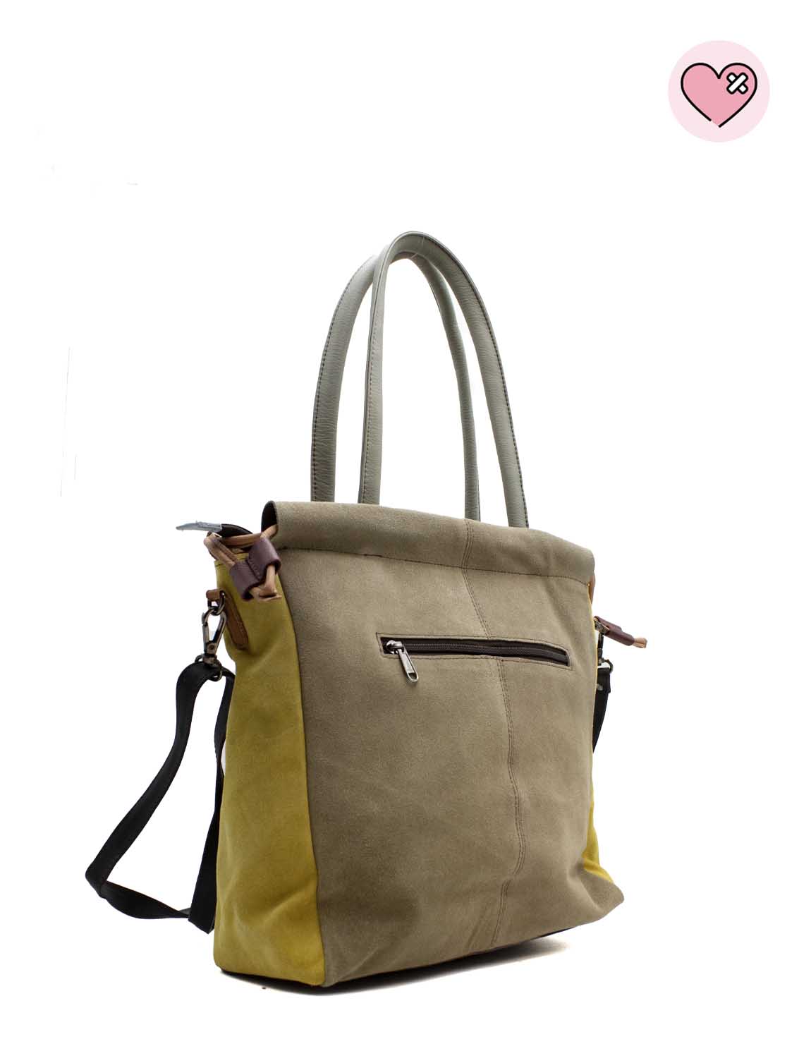 Damen-Schultertasche · Zweifarbiges recyceltes Leder · Handgefertigt · Zwei Tragegriffe und verstellbarer Schultergurt · Großes Fassungsvermögen für den täglichen Gebrauch