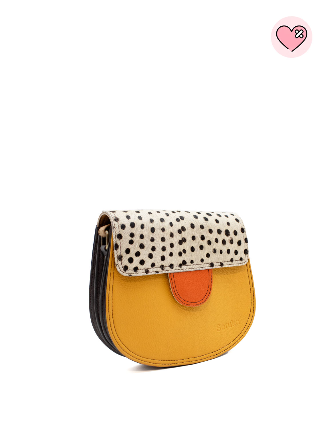Wunderschöne Schultertasche aus 100 % recyceltem Leder. Umweltfreundliche, handgefertigte Tasche mit Klappe in Animal-Print und gelbem Korpus.