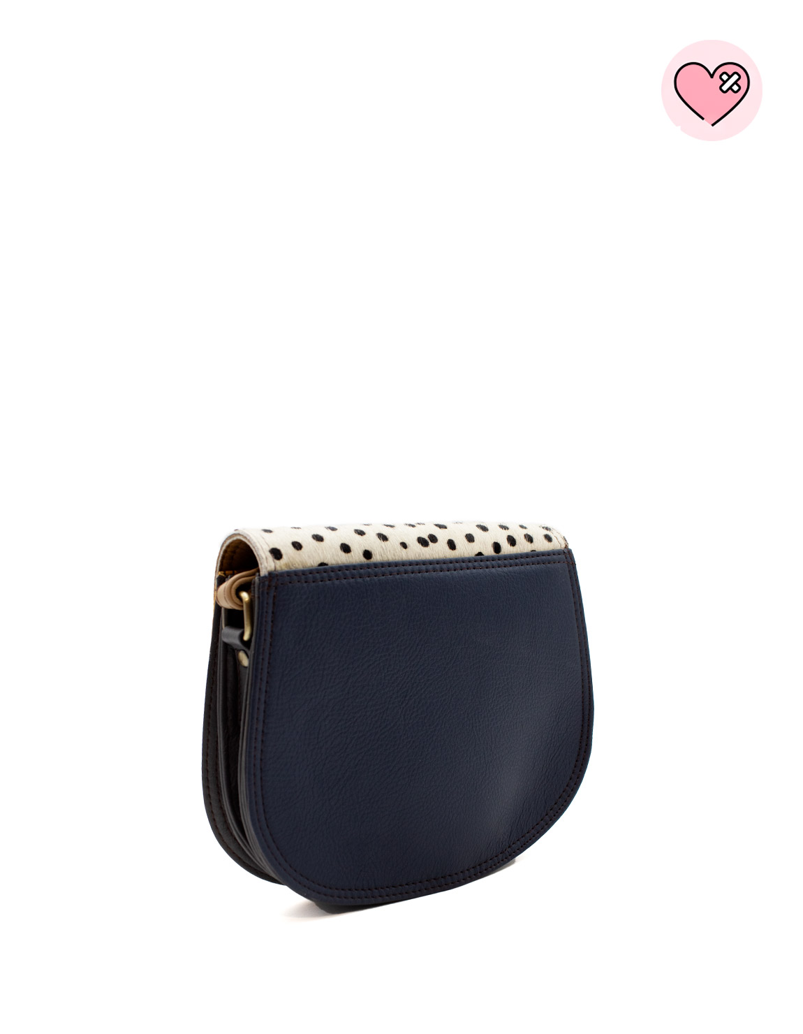 Diese kleine, sattelförmige Tasche ist ein Unikat und passt zu jedem Outfit. Sie verfügt über drei Innenfächer, eines davon mit Reißverschluss, sowie ein zusätzliches Reißverschlussfach.