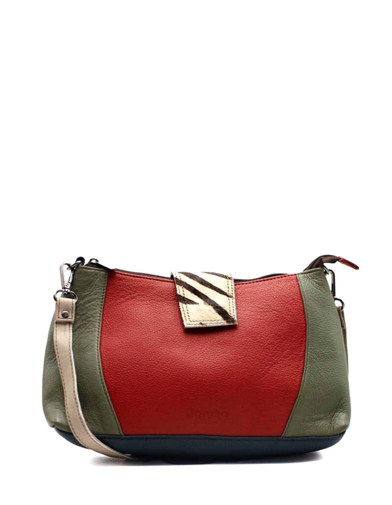 Schultertasche aus 100 % recyceltem Leder · Mittlere Größe mit dreifachem Reißverschluss · Verstellbarer und abnehmbarer Riemen · Handgefertigt.