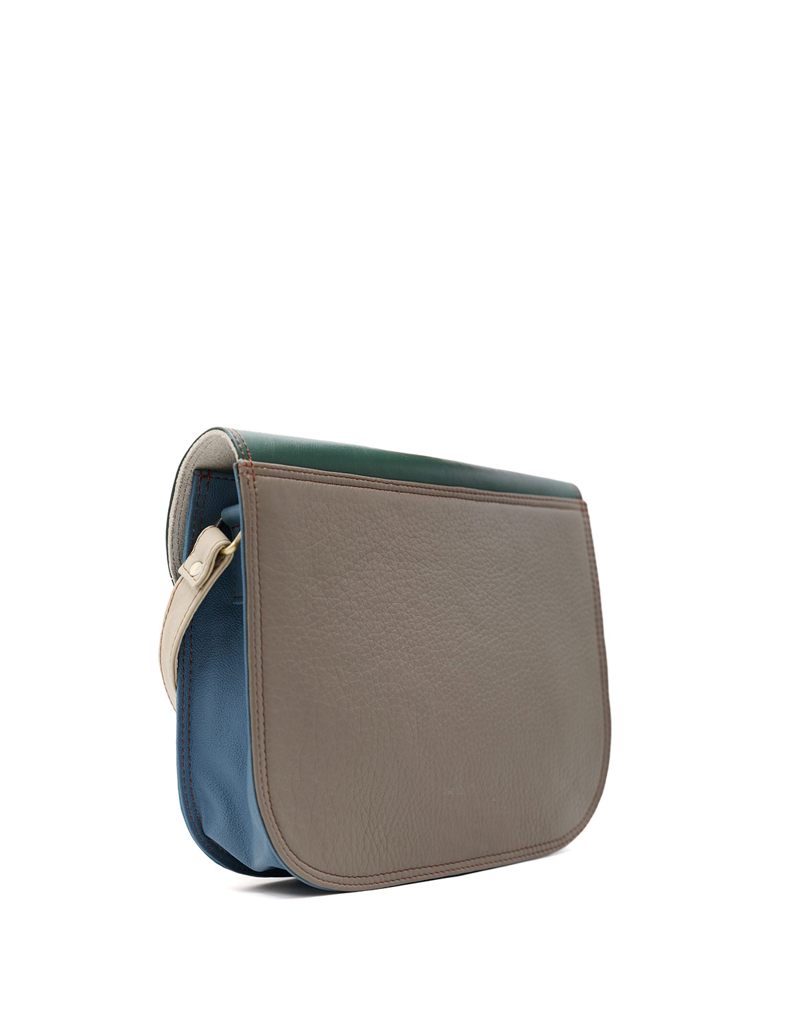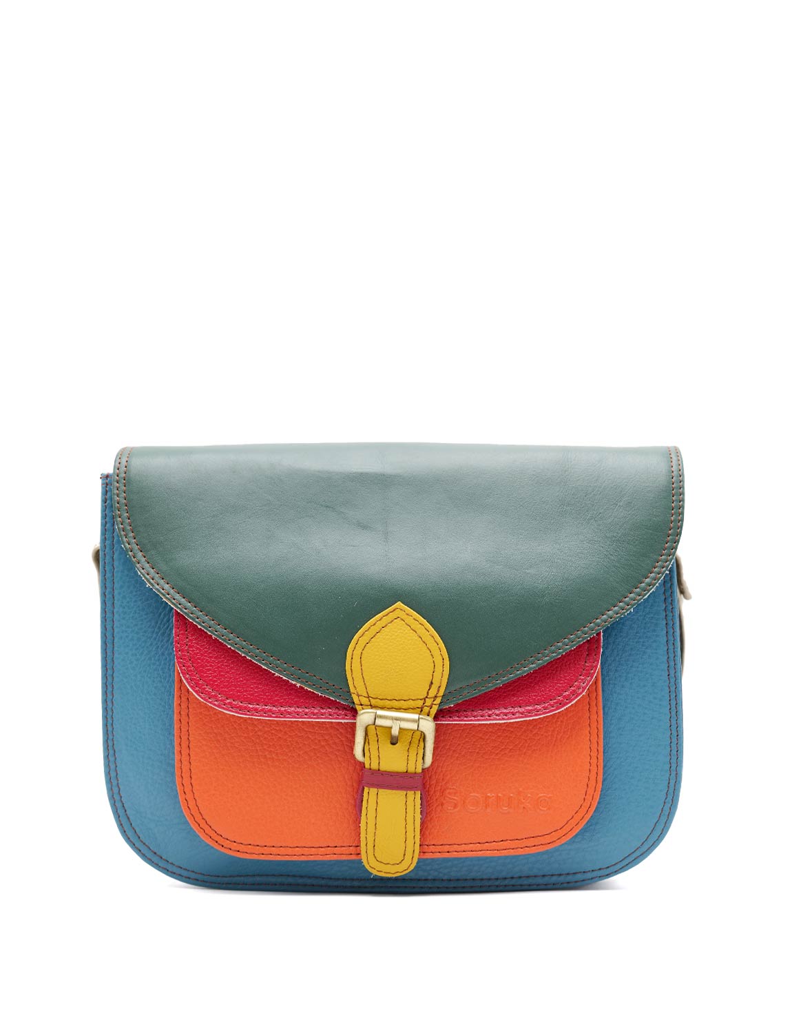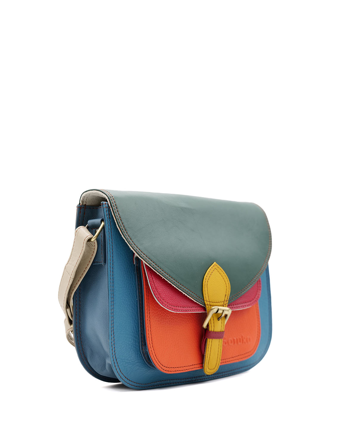 Bolso de cuero 100% reciclado en tonos azules, verdes y naranjas. Bolso bandolera de tamaño medio, sostenible y hecho a mano.