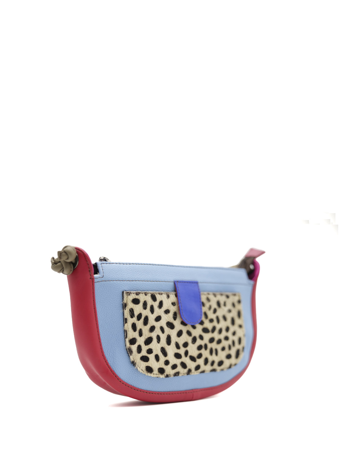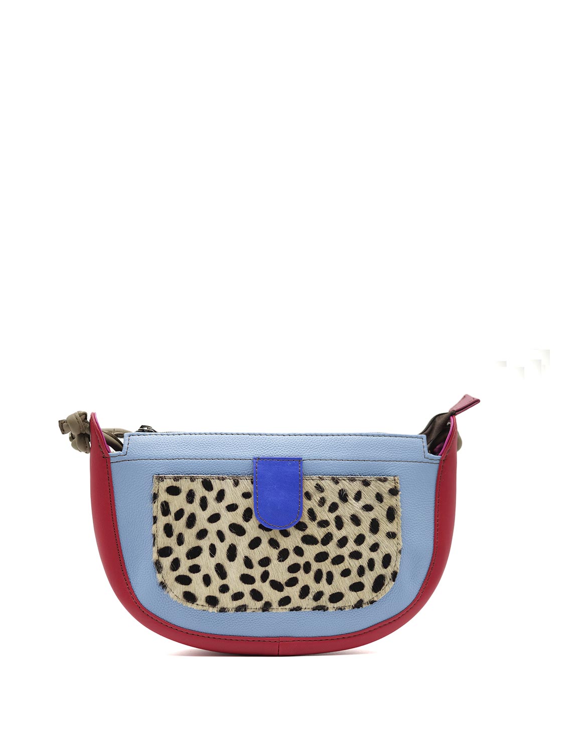 Precioso bolso bandolera de piel 100% reciclada. Bolso ecológico hecho a mano en tonos azul claro y con estampado animal en el bolsillo delantero.