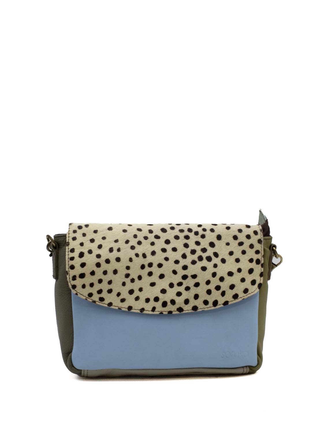 Precioso bolso bandolera de piel 100% reciclada con estampado animal en color azul.