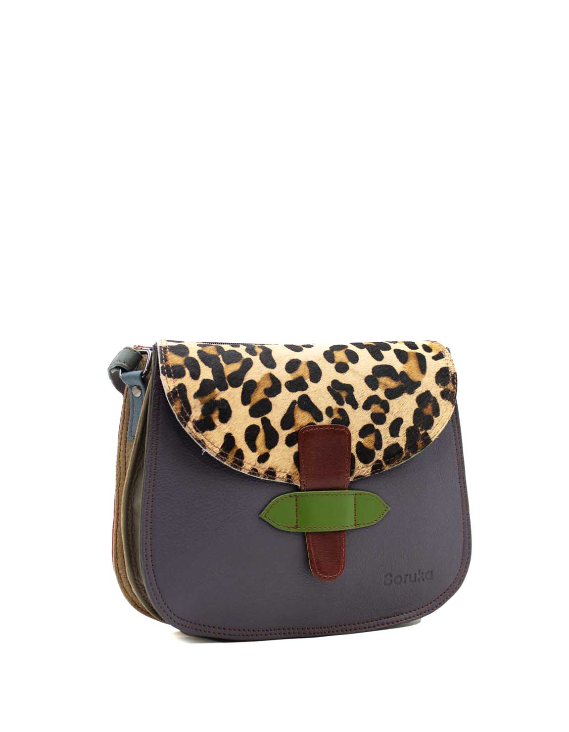 ¡Llévalo de dos maneras! ¡Es como tener 2 bolsos en 1! La solapa del bolso es reversible: un lado viene en tonos verdes y rojos, y el otro en azul oscuro con estampado animal de pelo.