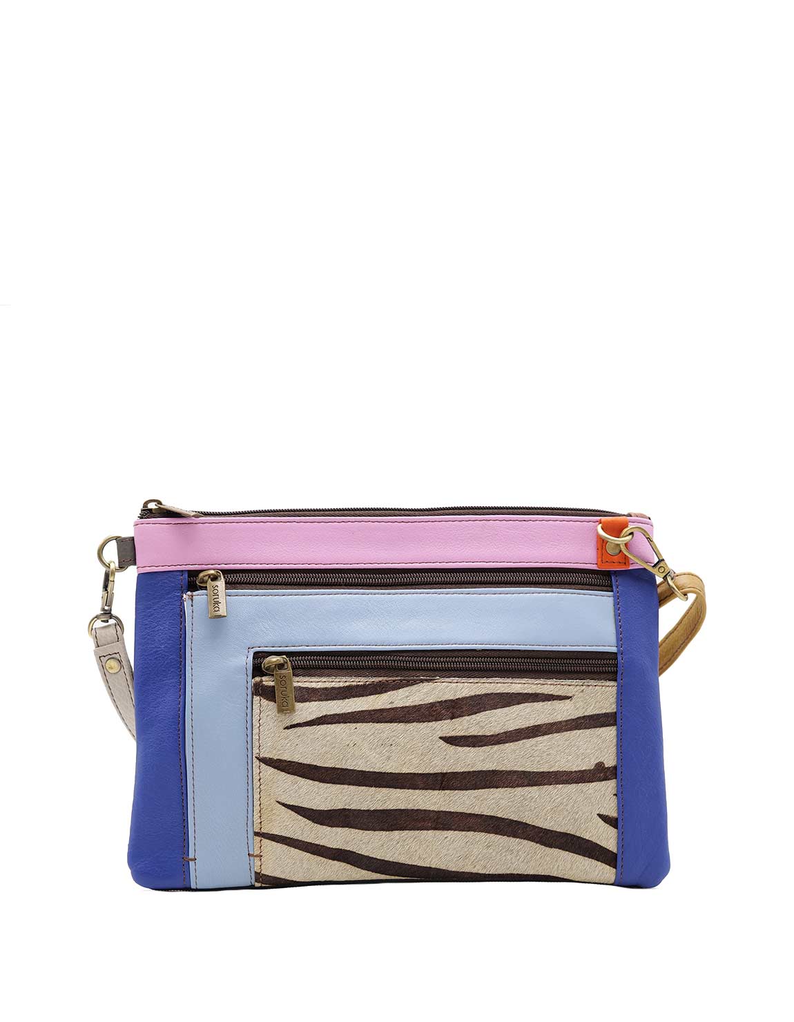 Bolso bandolera cruzado de piel 100% reciclada, hecho a mano en tonos azul y rosa. De medida mediana, muy ligero y resistente, pensado para acompañarte a diario sin ocupar de más. Ofrece triple compartimento con cremallera para separar móvil, cartera y llaves; además, incorpora bolsillo interior forrado para pequeños imprescindibles y bolsillo frontal con print animal de acceso rápido que añade un toque distintivo. El cierre superior con tirador de piel mantiene todo seguro, mientras que la correa ajustable y extraíble te permite llevarlo al hombro o cruzado según la ocasión. Una pieza única y sostenible que combina practicidad y estilo.