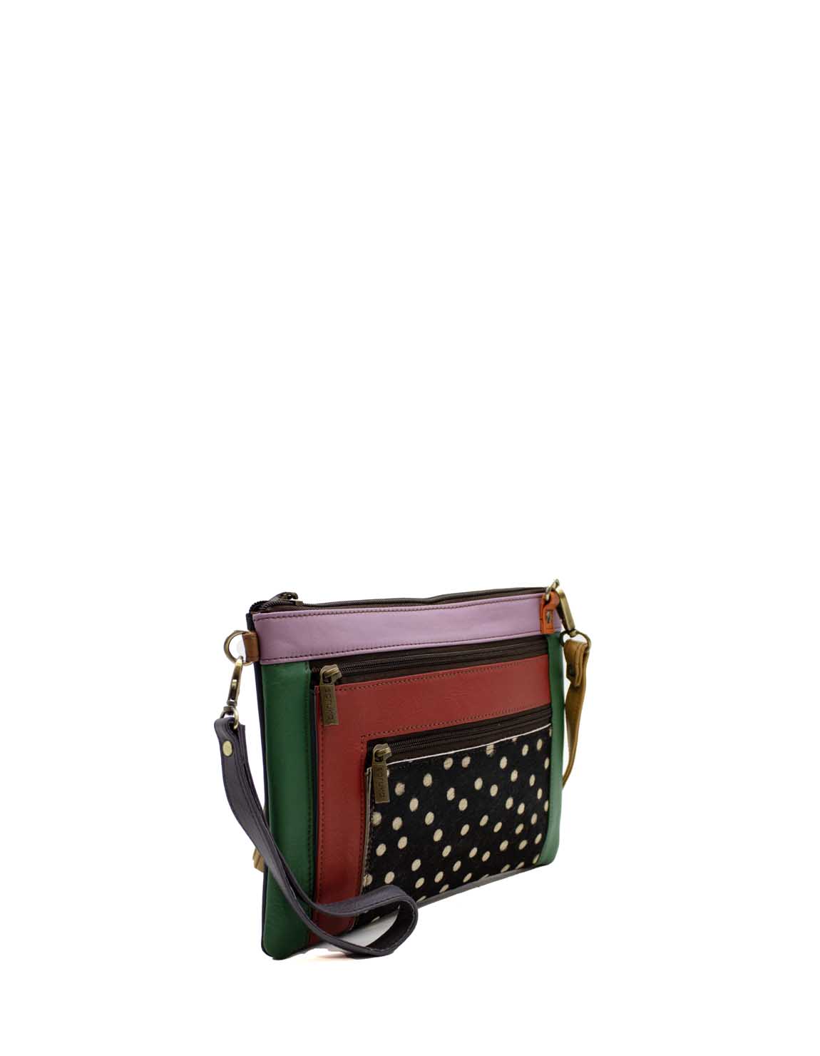 Bolso bandolera hecho a mano con piel 100 % reciclada en tonos rojo y verde. De tamaño mediano, ligero y resistente, está diseñado para el día a día sin ocupar mucho espacio. Cuenta con tres compartimentos con cremallera para separar el teléfono, la cartera y las llaves; además, cuenta con un bolsillo interior forrado para pequeños objetos esenciales y un bolsillo frontal de acceso rápido con estampado animal para un toque distintivo. El cierre superior con tirador de piel lo mantiene todo seguro, mientras que la correa ajustable y extraíble permite llevarlo al hombro o cruzado, según la ocasión. Una pieza única y sostenible que combina practicidad y estilo.