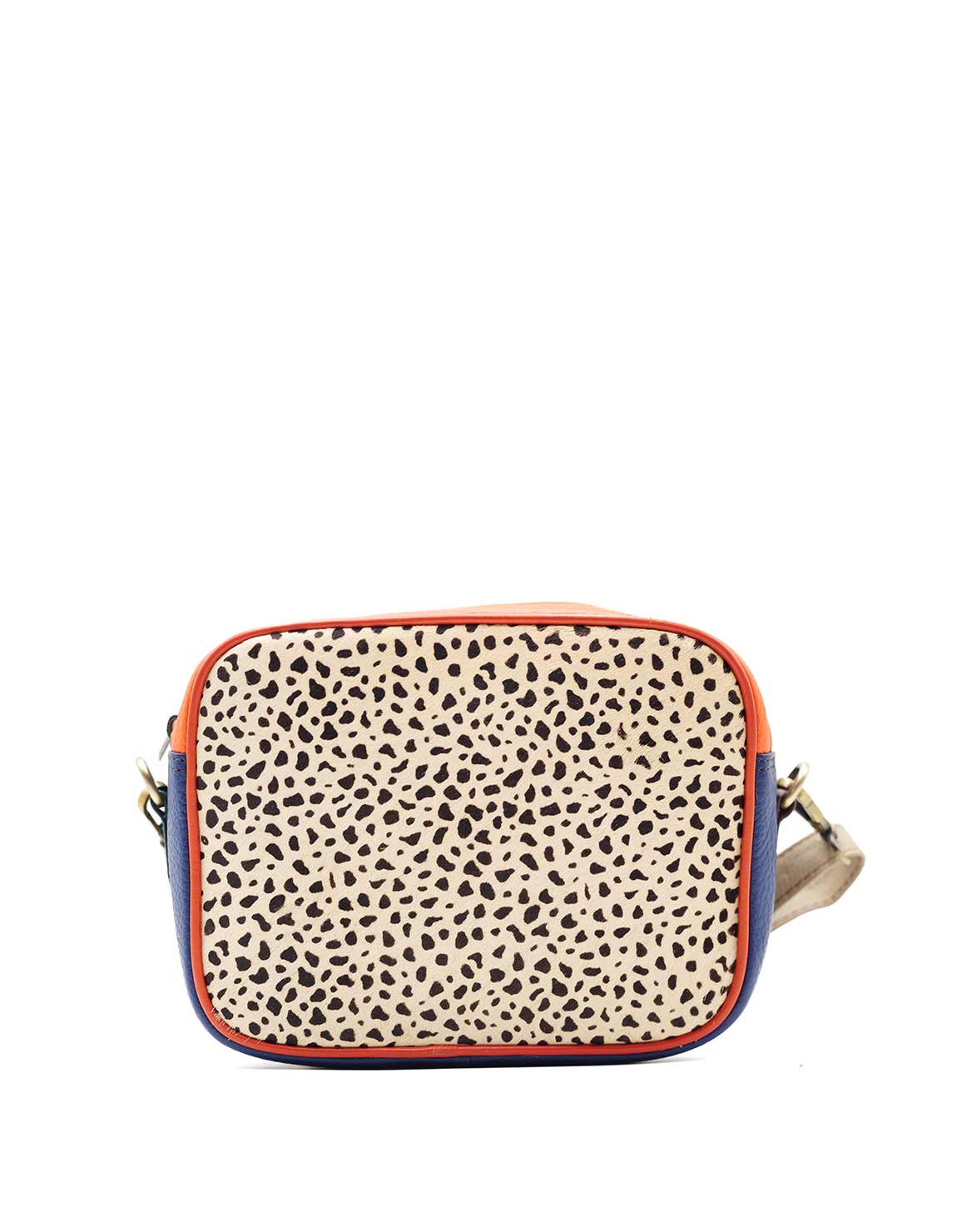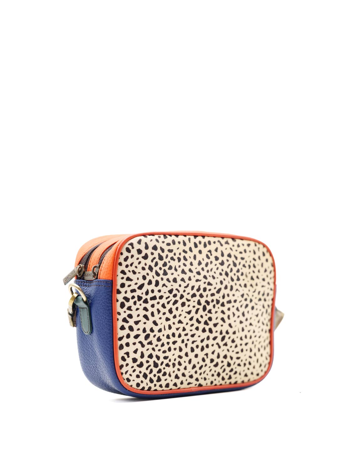 Haz una declaración de estilo con este llamativo bolso bandolera de estampado animal, elaborado con cuero reciclado para un toque único y sostenible. Su diseño compacto pero espacioso cuenta con dos compartimentos con cremallera, garantizando que te mantengas organizada sin esfuerzo mientras te mueves.