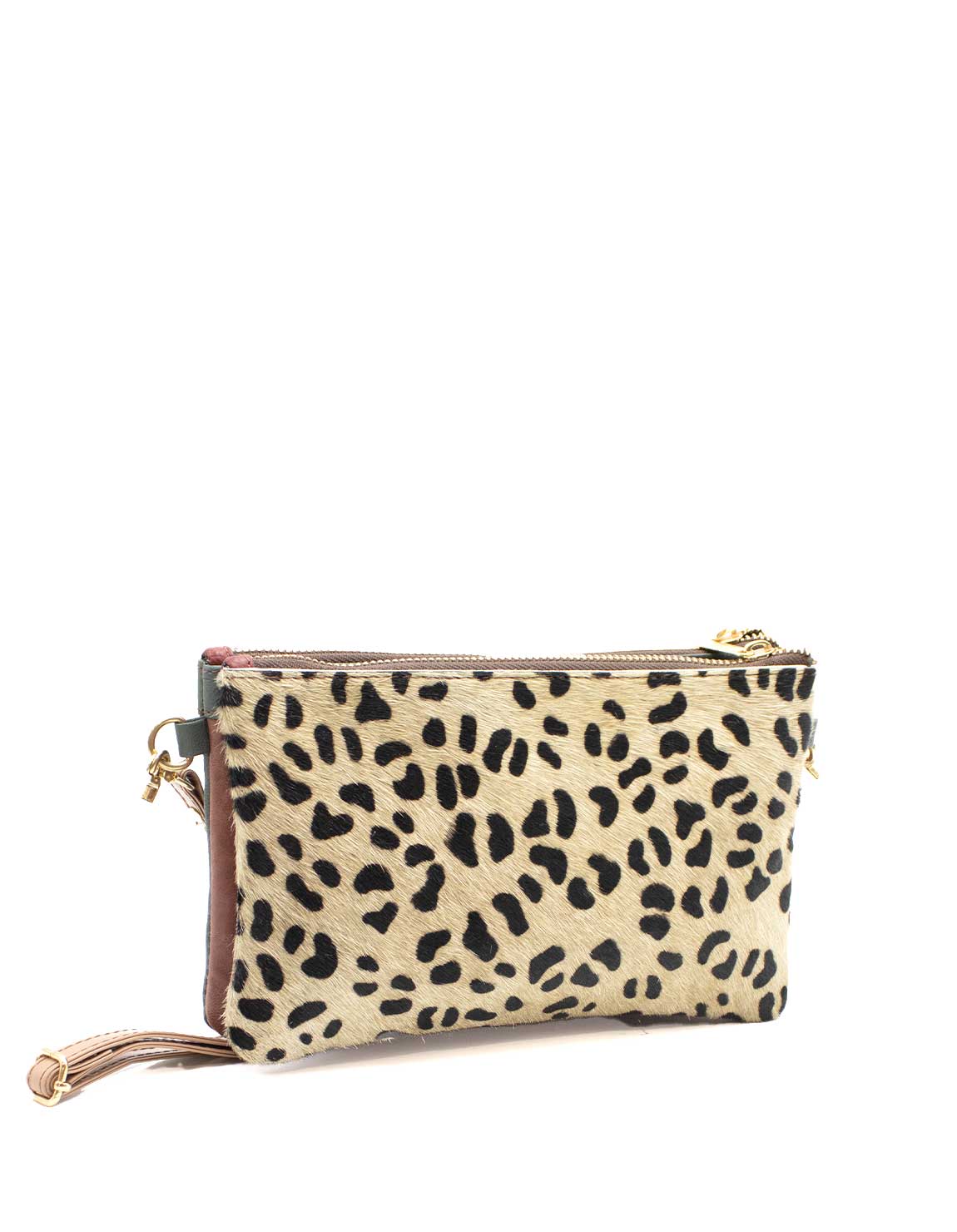 Hermoso bolso bandolera de cuero reciclado que marcará la diferencia cuando lo lleves y añadirá un toque original y sofisticado a tu look. Bolso artesanal con espectacular estampado animal print en el frontal, combinado con piel lisa en tonos verdes y marrones en la parte trasera, creando una mezcla moderna y única.