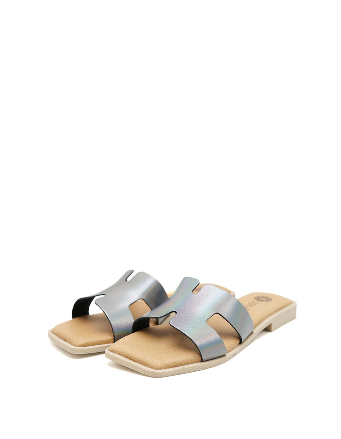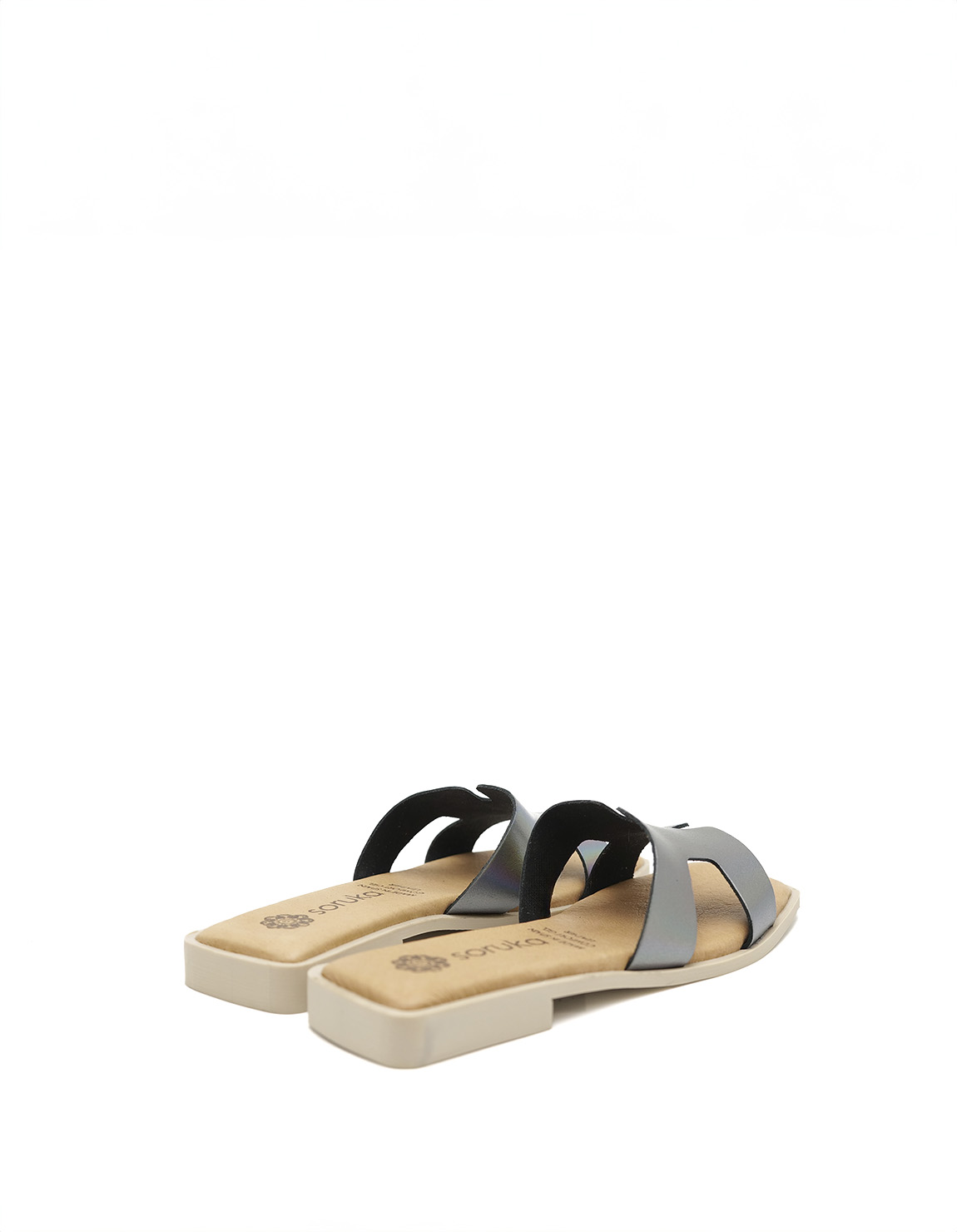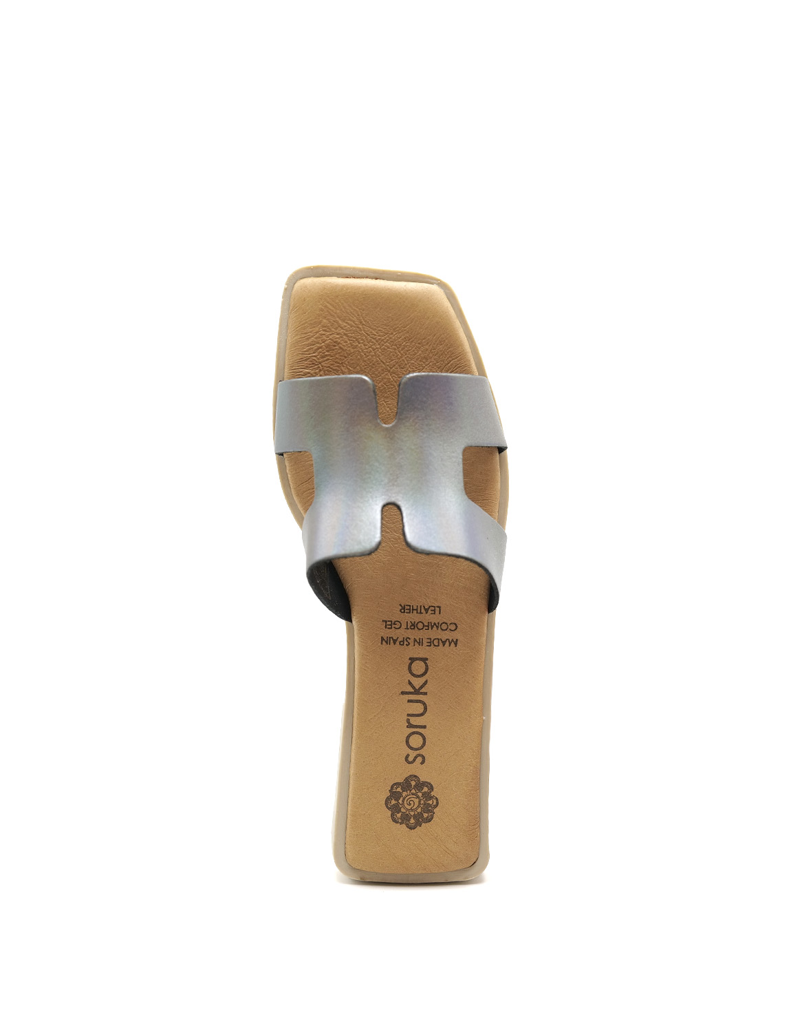 Sandales pour femmes – 100 % cuir recyclé – Chaussures de confort – Sandale plate de couleur unie en cuir métallisé – Fabriquées en Espagne