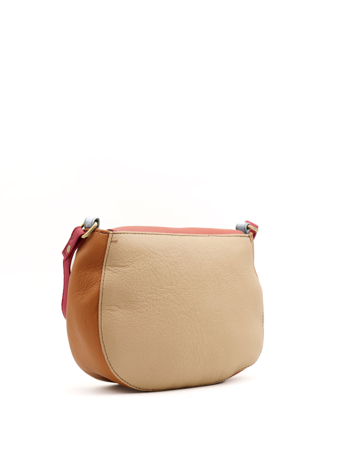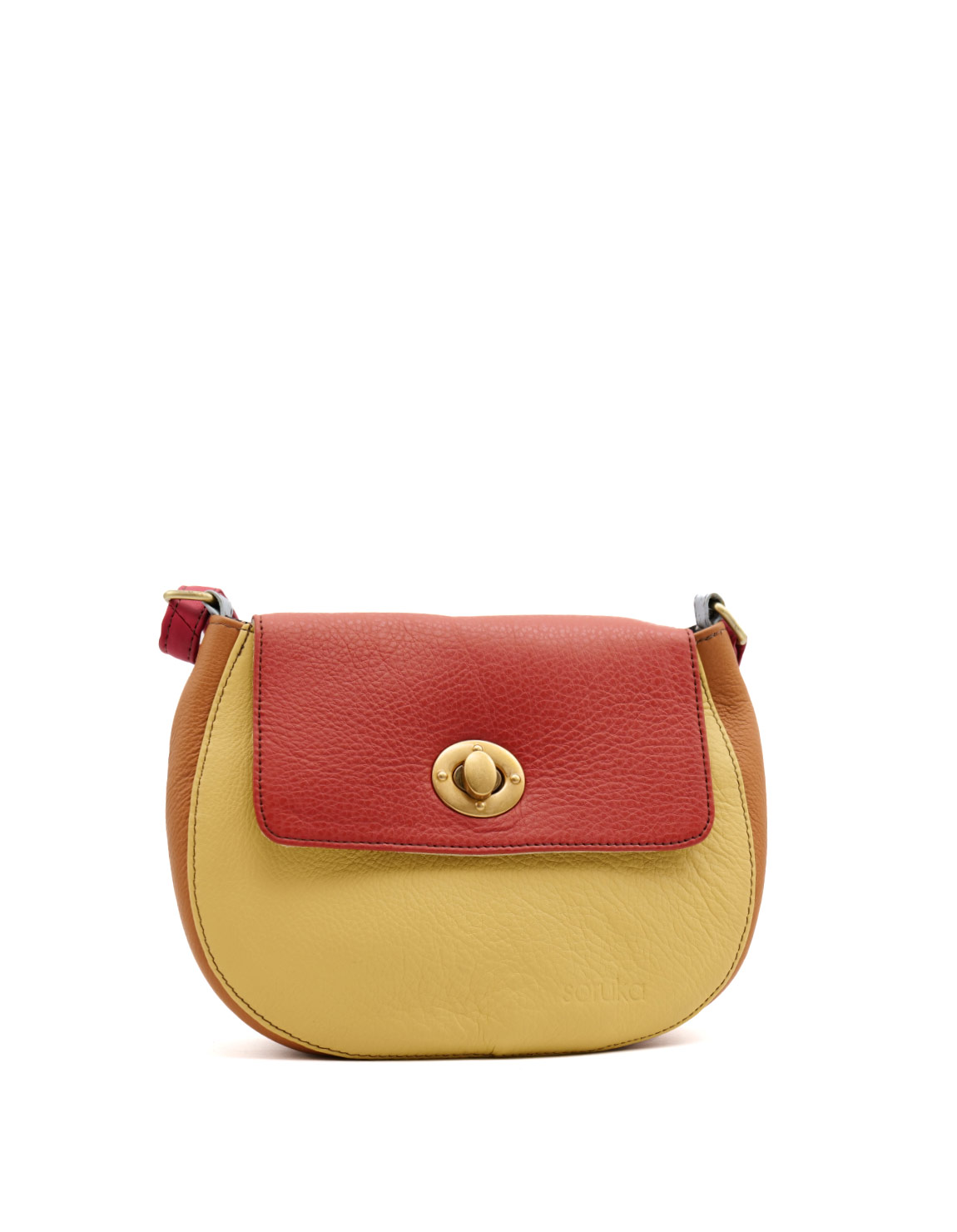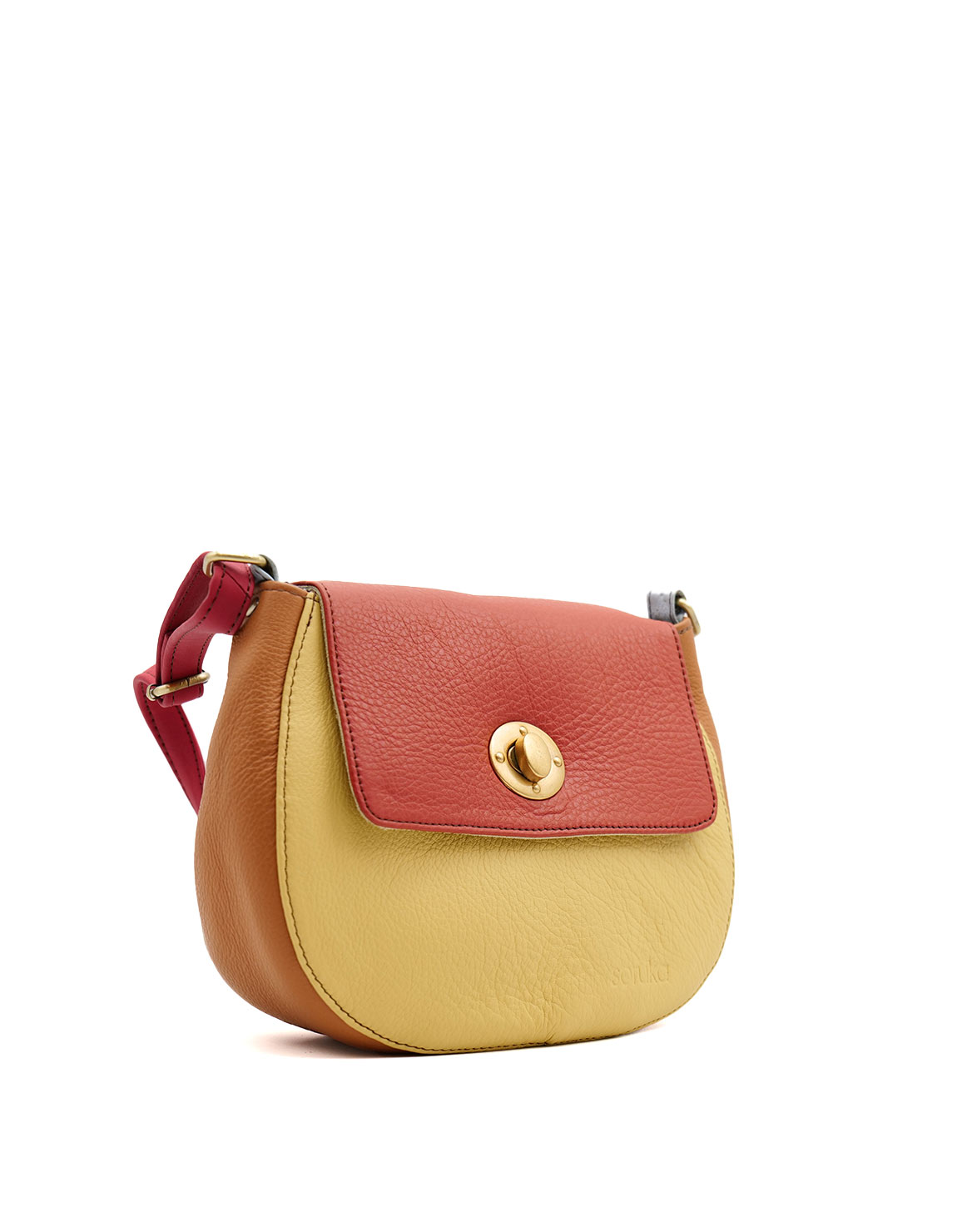 Ce petit sac coloré de forme ronde est unique et s’adapte à tous les styles. Il est doté d’une longue sangle réglable qui permet de le porter à l’épaule ou en bandoulière. Il se ferme à l’aide d’une fermeture en métal. Une poche zippée supplémentaire se trouve à l’intérieur du compartiment principal.