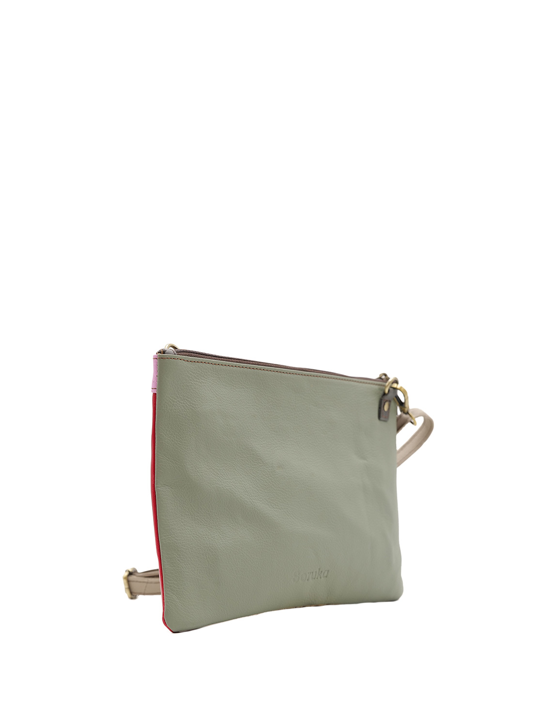 Sac bandoulière en cuir 100% recyclé · Taille moyenne avec triple fermeture éclair · Bandoulière réglable et amovible · Fait main.