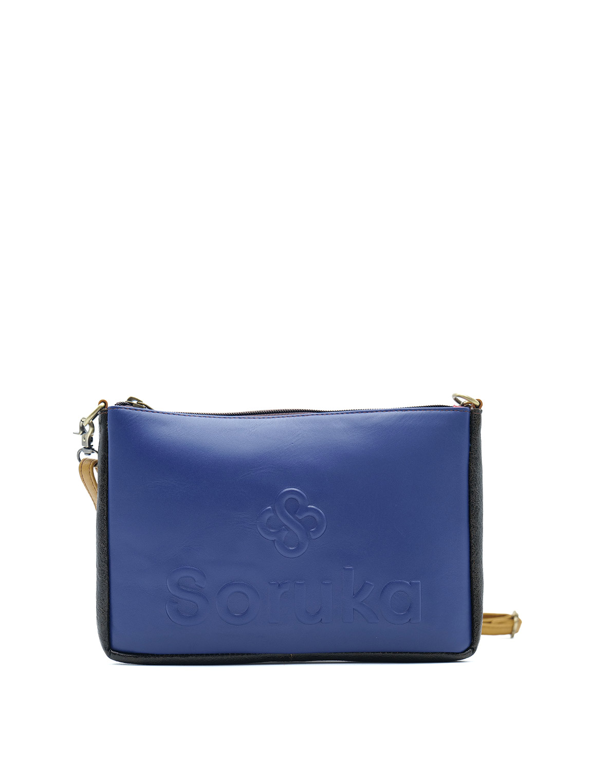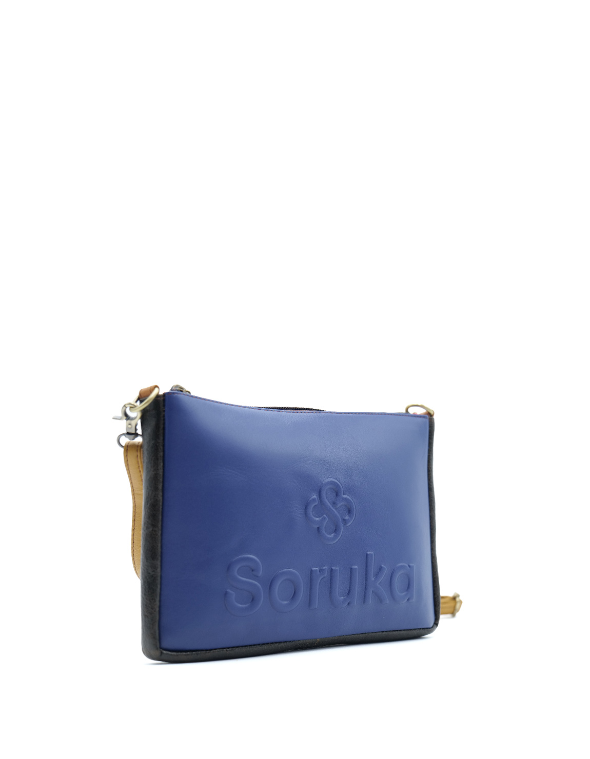 Sac à main minimaliste en cuir 100% recyclé dans les tons de bleu. Sac moyen en cuir recyclé fait à la main. Bandoulière réglable également en cuir.