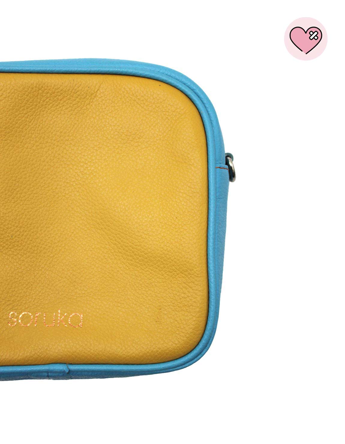 Sac en cuir 100 % recyclé. Produit respectueux de l’environnement fait à la main dans les tons orange vif, jaune et bleu.