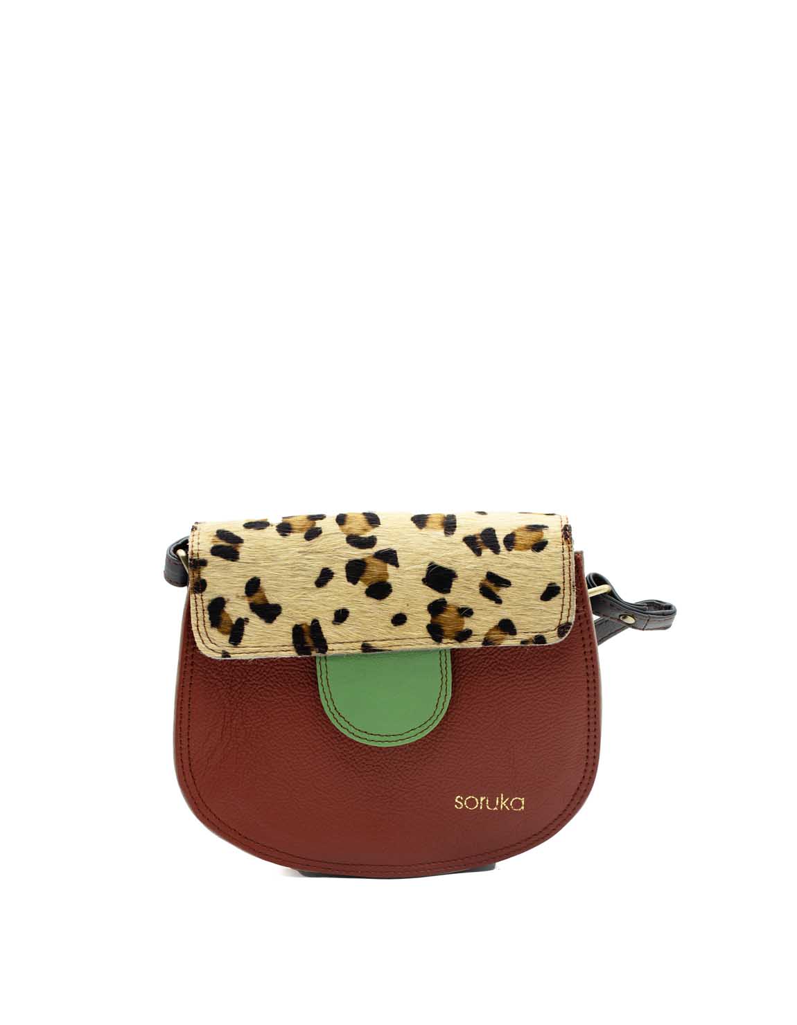 Magnifique sac bandoulière 100 % cuir recyclé. Sac éco-responsable fait main avec rabat imprimé animal et corps rouge.