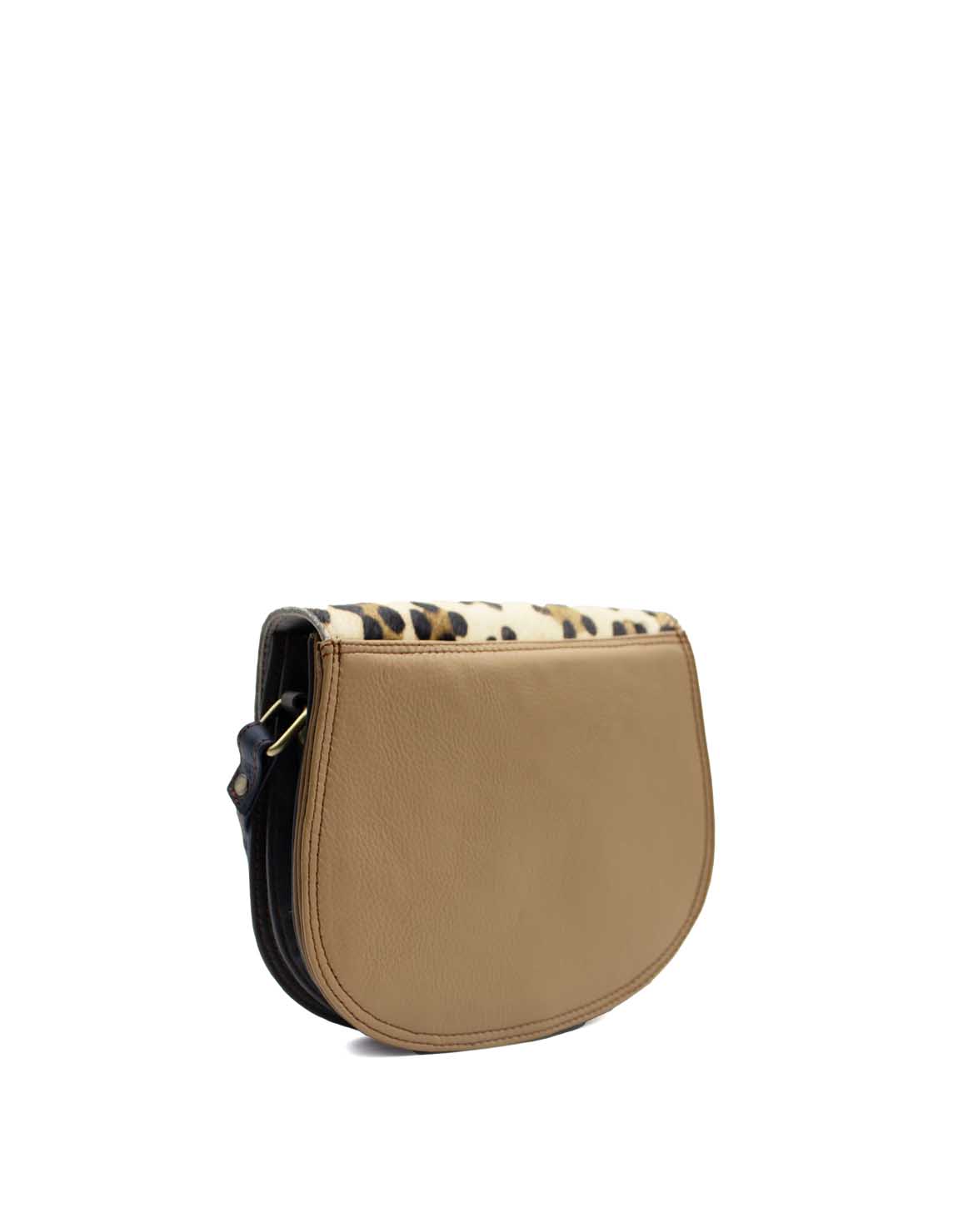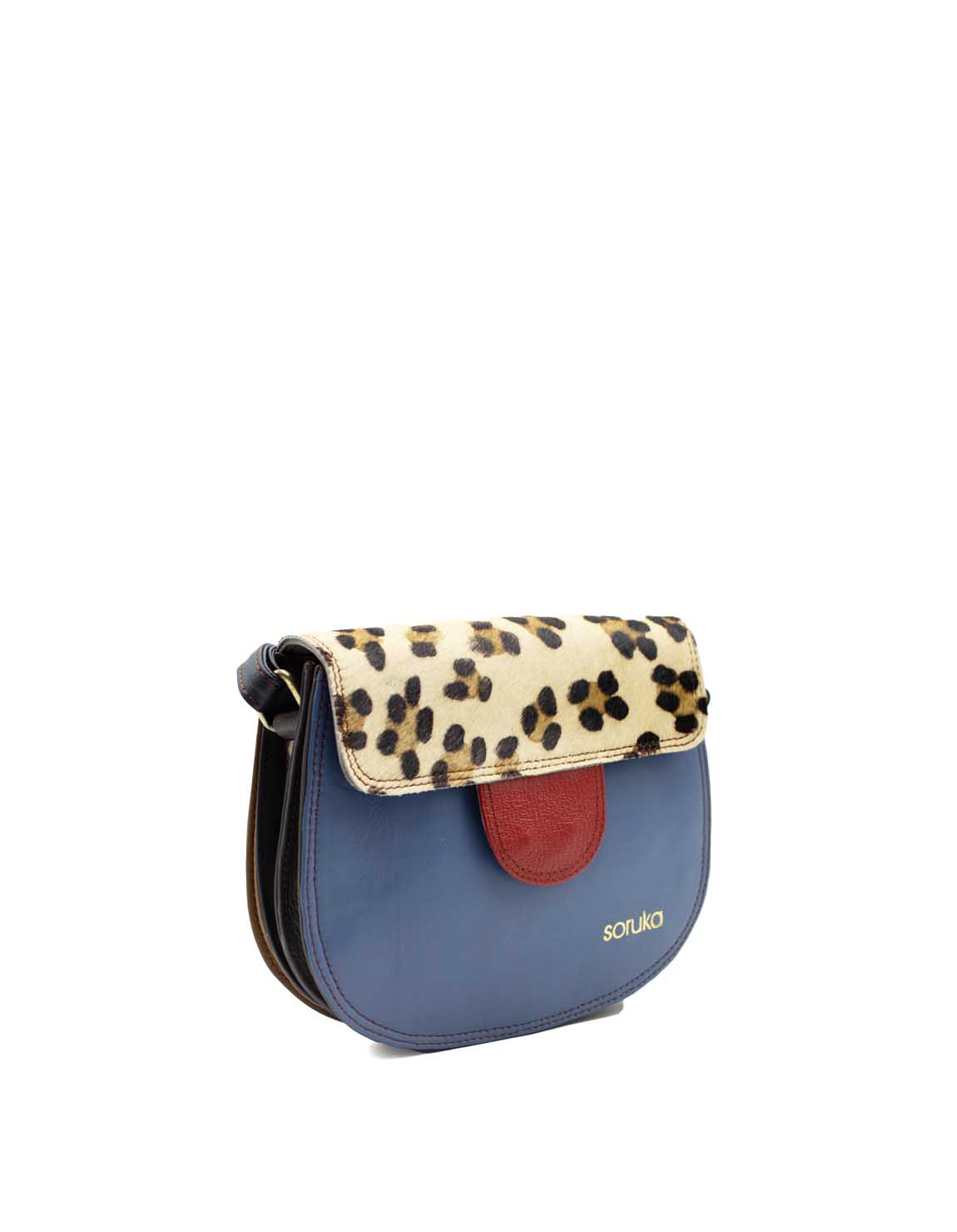 Magnifique sac bandoulière 100 % cuir recyclé. Sac éco-responsable fait main avec rabat imprimé animal et corps bleu clair.