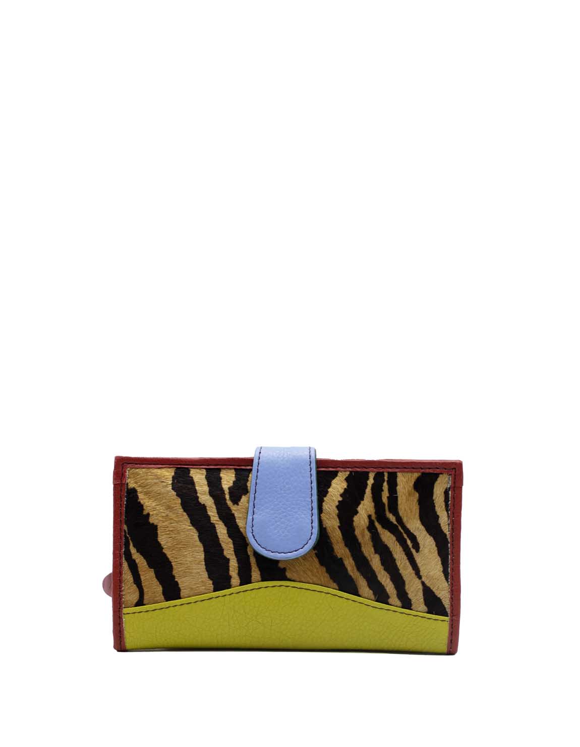 Portefeuille artisanal en cuir véritable, imprimé animal, de couleur jaune. Magnifique portefeuille éco-responsable fabriqué à partir de cuir recyclé.