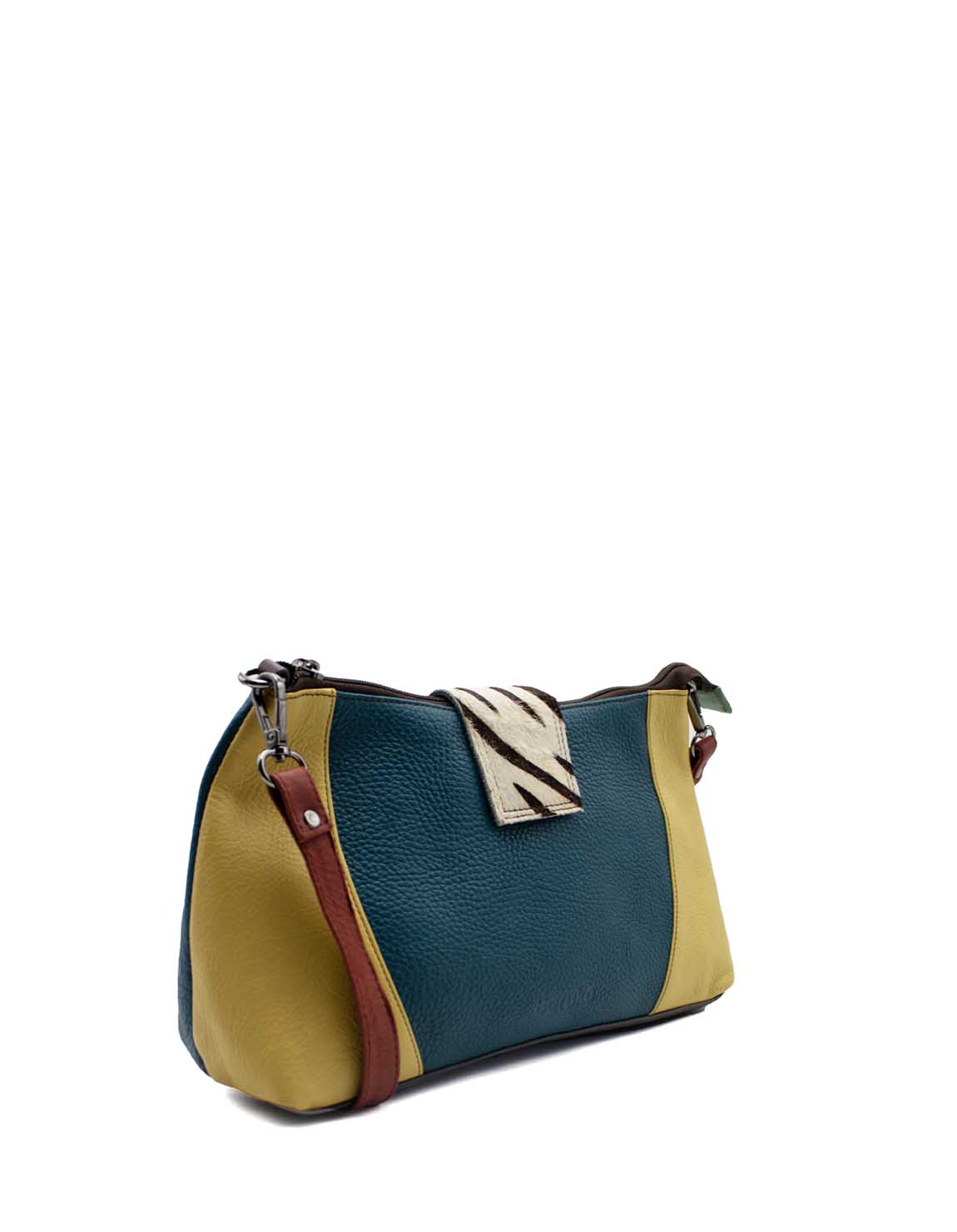 Stylish and sustainable, this medium-sized crossbody bag, handcrafted from recycled leather, is the perfect blend of elegance and functionality. Designed for everyday use, it features a sleek silhouette in yellow and blue tones with a touch of bold animal print for a striking look.