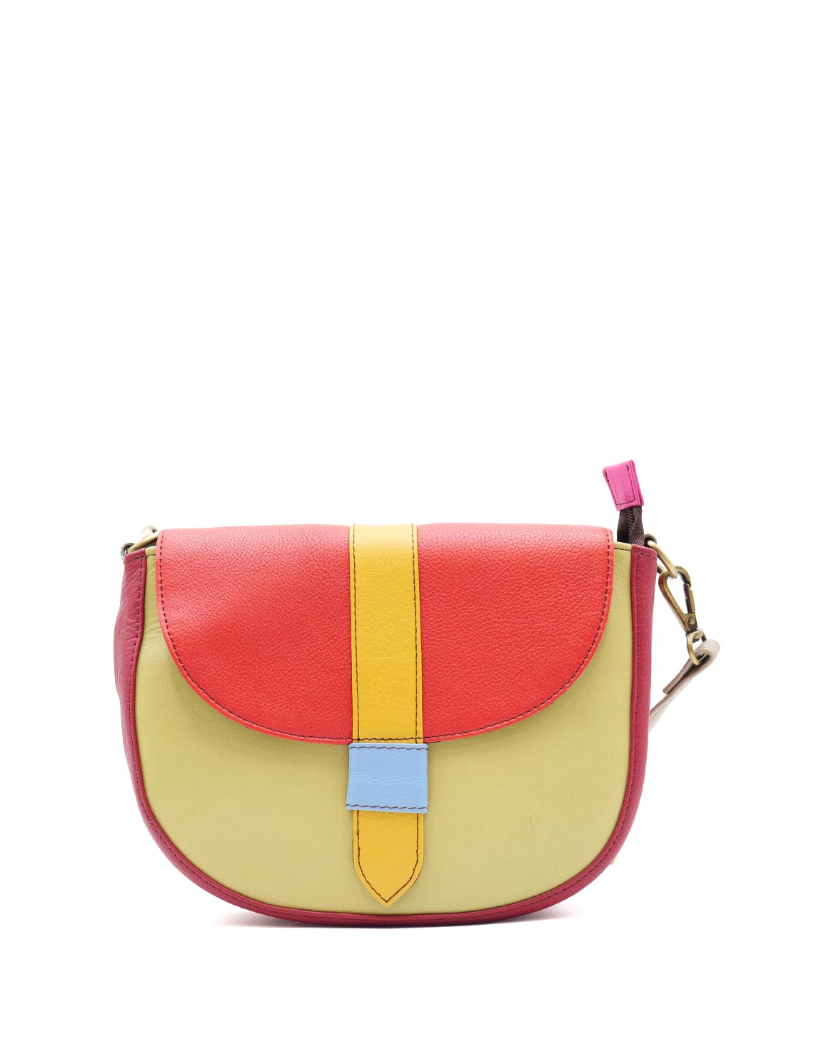 This colorful medium saddle-shaped bag is unique and will make a statement when you wear it. Perfect size to fit all your everyday items.