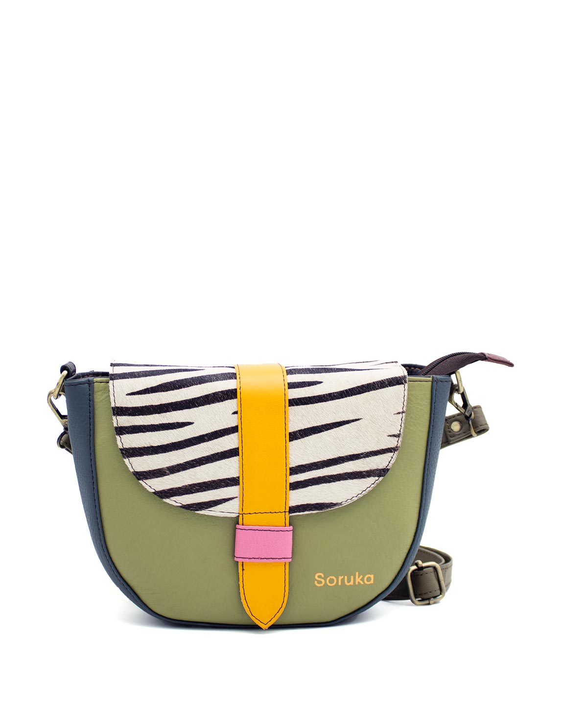 This colorful medium saddle-shaped bag is unique and will make a statement when you wear it. Perfect size to fit all your everyday items.