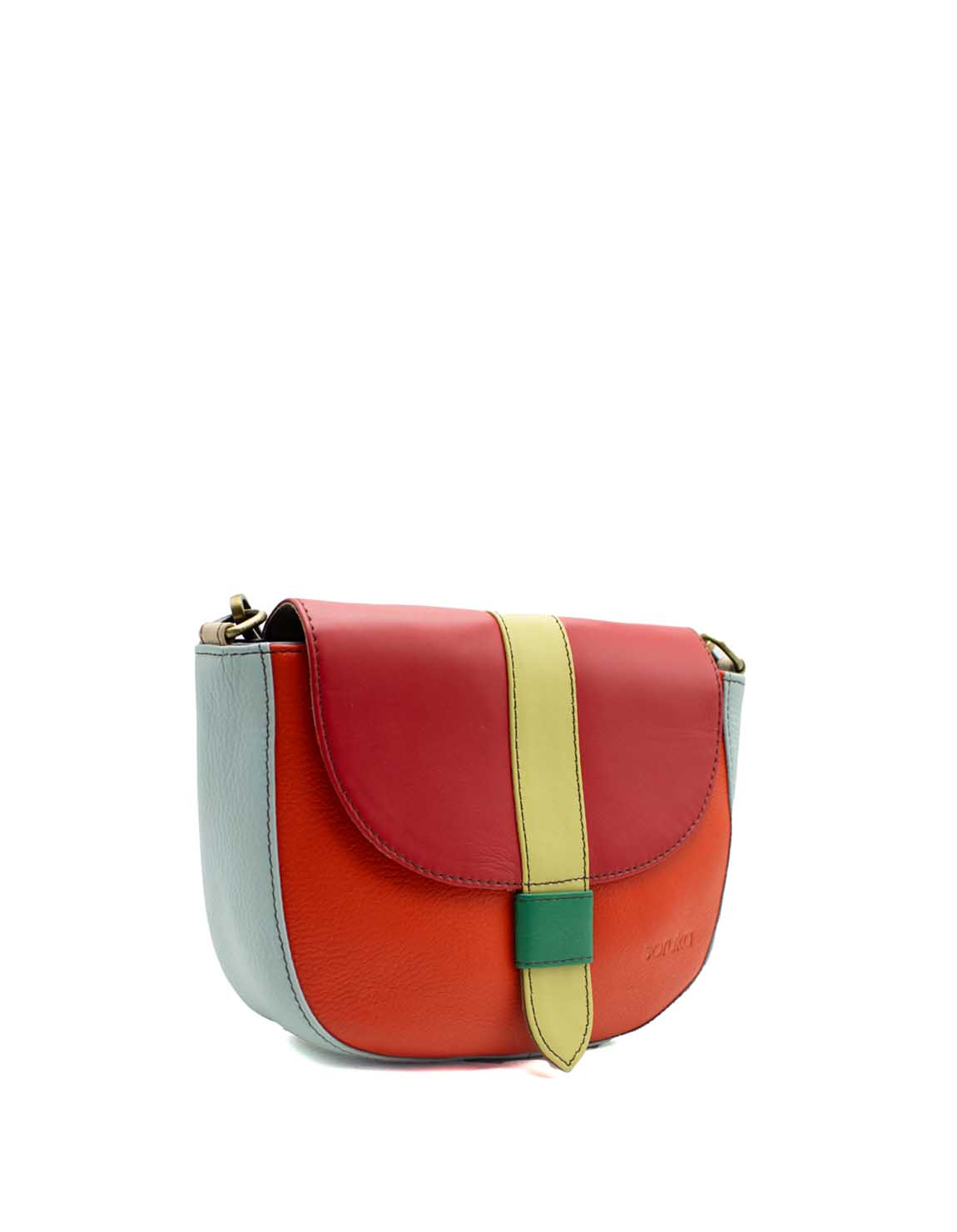 This colorful medium saddle-shaped bag is unique and will make a statement when you wear it. Perfect size to fit all your everyday items.