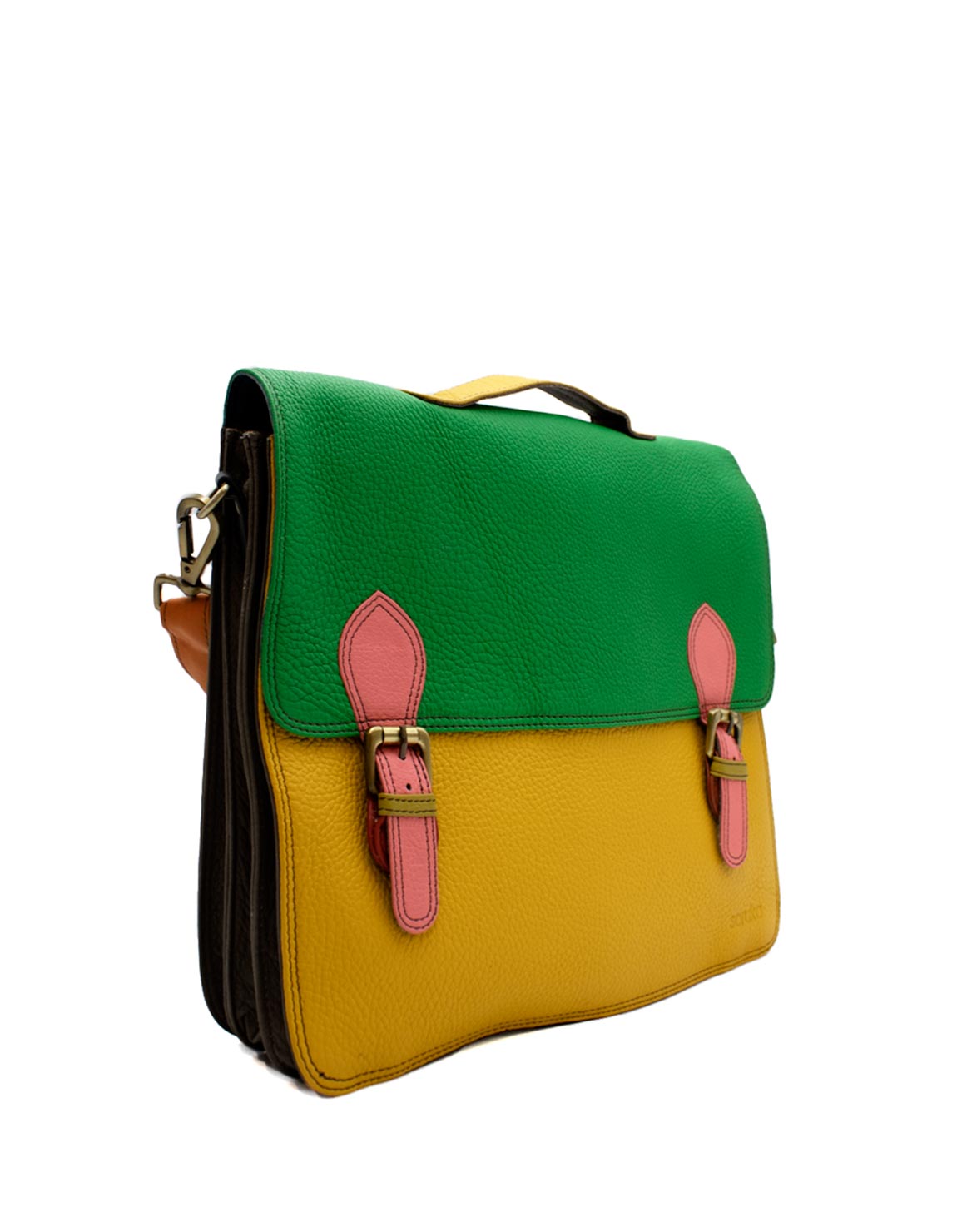 100% recycled leather briefcase with yellow body and green flap. Beautiful handmade eco-friendly shoulder bag with top handle.