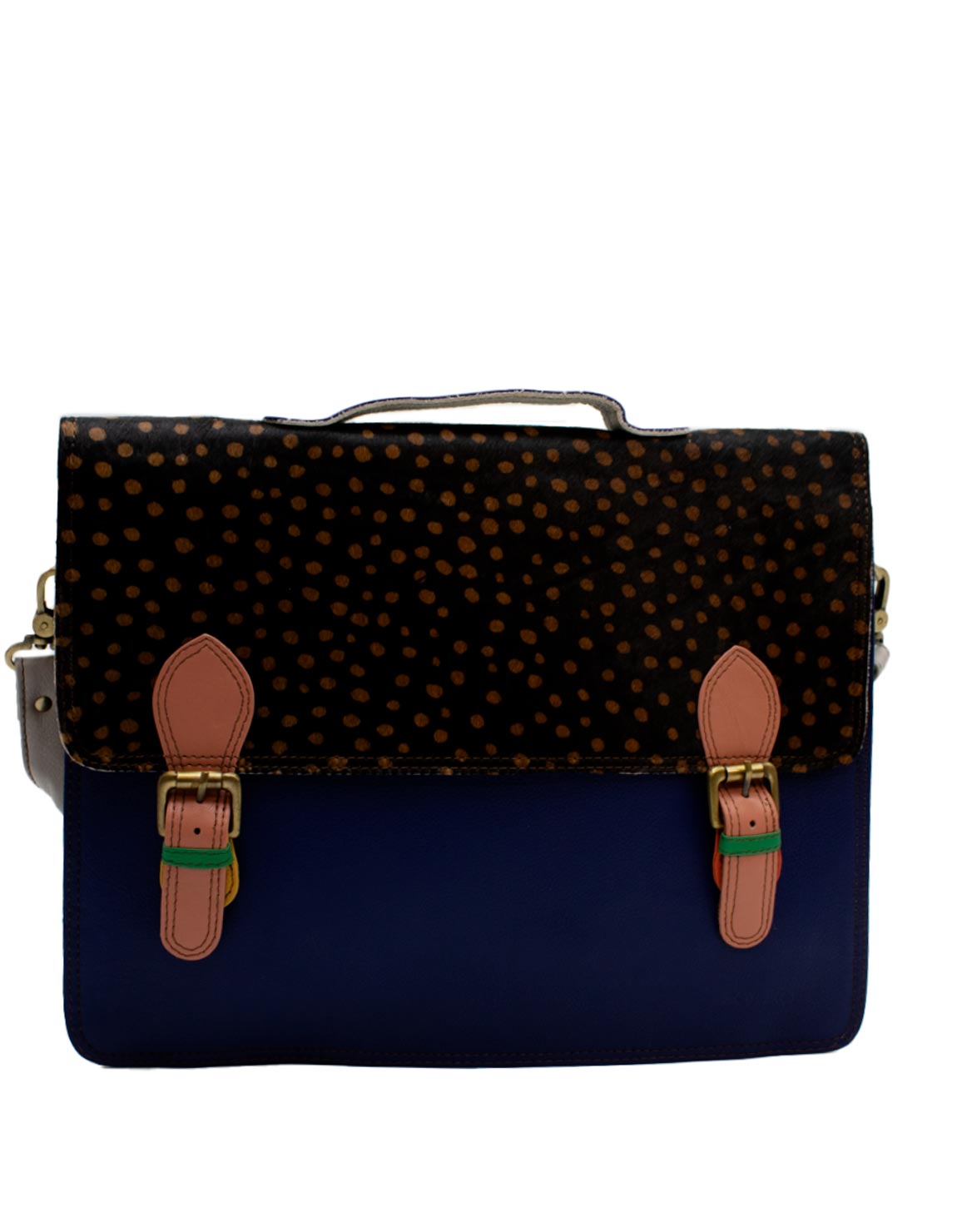 100% recycled leather briefcase with a flap featuring an animal print and dark blue tones. Beautiful handmade eco-friendly crossbody bag with a top handle.