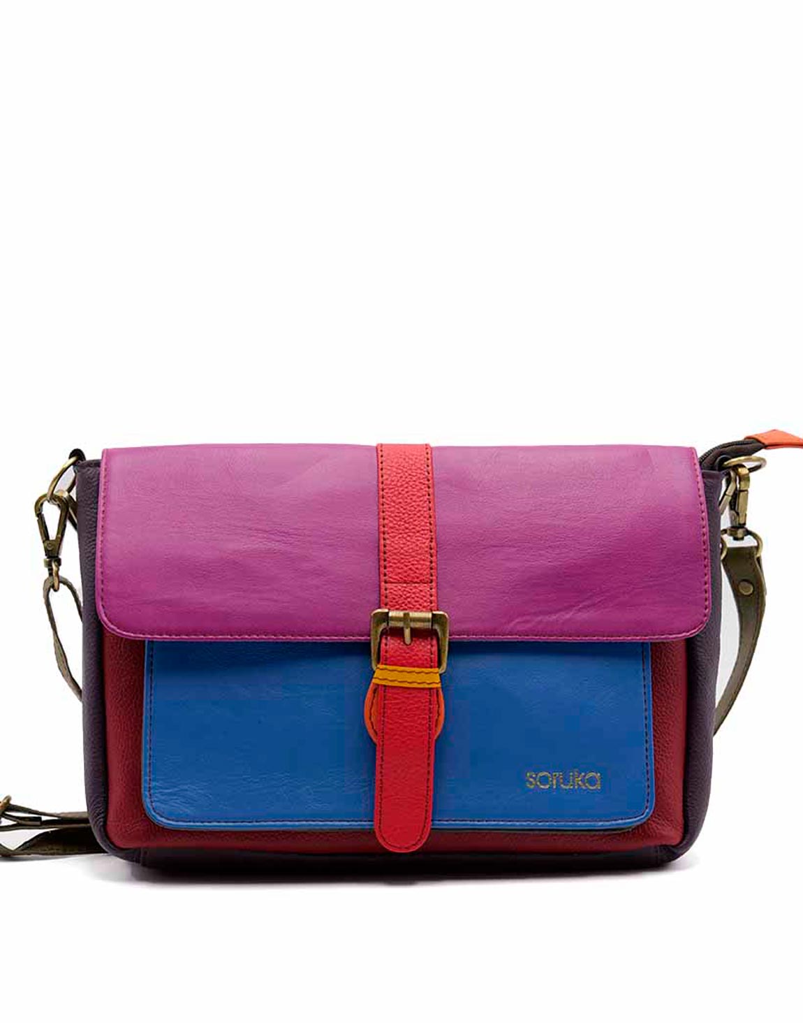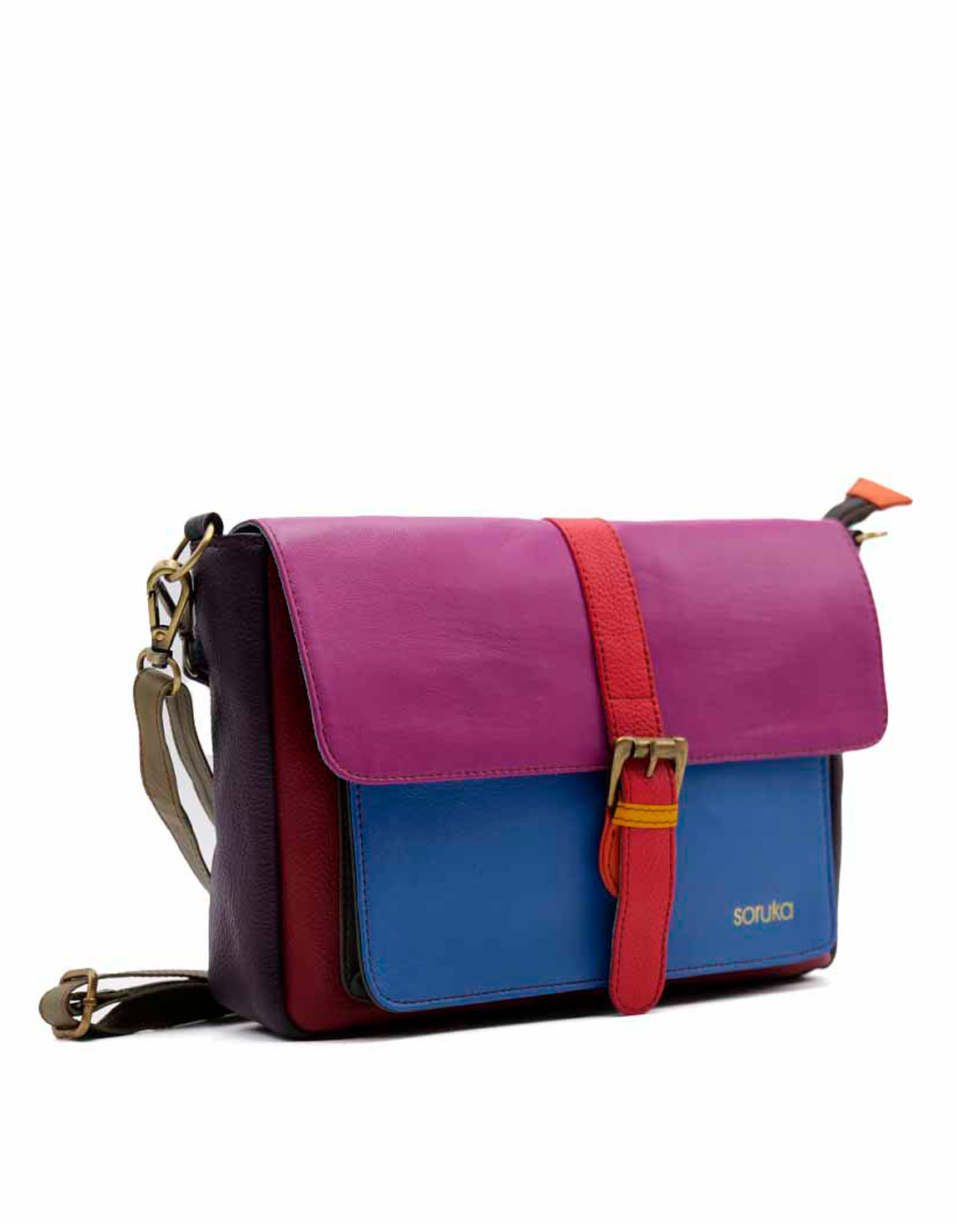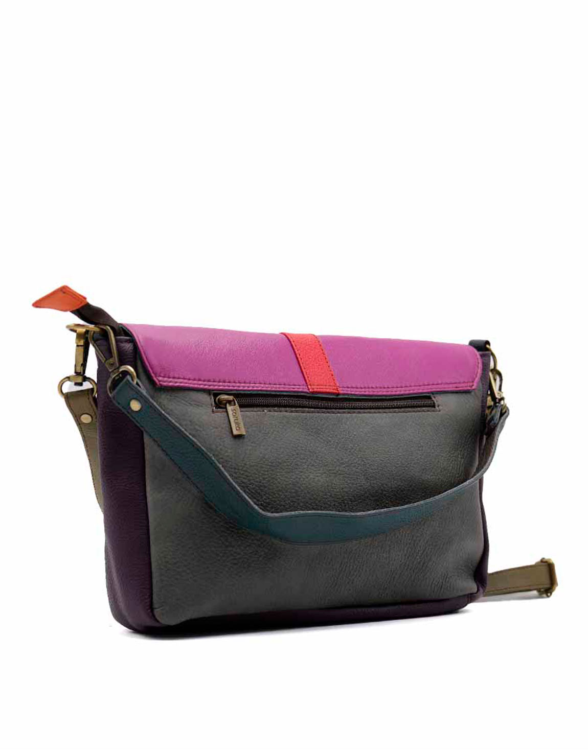 This colorful satchel bag is unique and complements all types of looks. It’s the perfect size for storing all your essentials! The bag features two compartments: one open pocket under the flap and a main compartment, which includes a zipper pocket. There’s also an extra zipper pocket on the back. It fastens securely with a magnetic stud beneath the buckle.