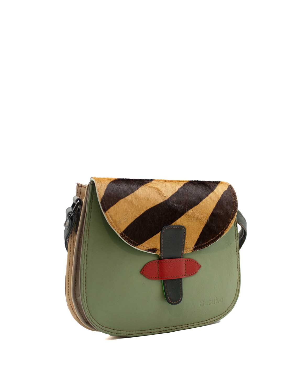 Wear it Both Ways! Is Like Having 2 Bags in 1! The Flap of the Bag Reverses and one side comes in Shades of Light Blue and Brown and on one the other side in Green and Hair-On Animal Print.