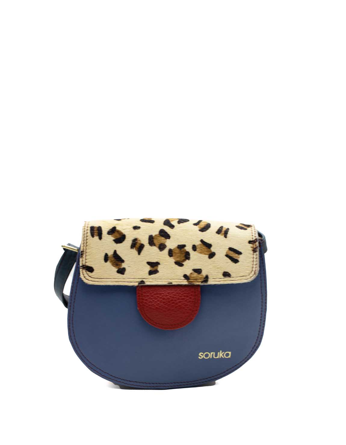 This colorful small saddle-shaped bag is unique and complements all types of looks. It comes with three internal compartments, one with a zipper. Additional pocket zipper on the inside.