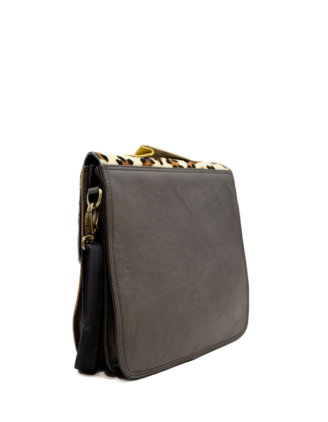 100% Recycled Leather Briefcase in Shades of Orange and with Animal print flap. Beautiful Eco-friendly Handmade Messenger Bag with Top Handle.