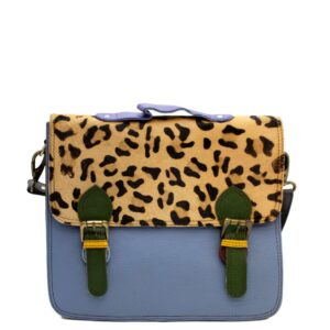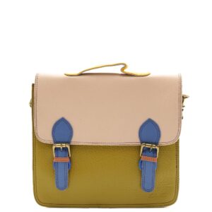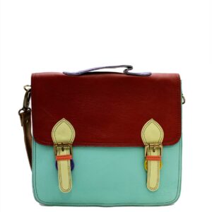 100% Recycled Leather Briefcase in shades of Blue and Yellow. Beautiful Eco-friendly Handmade Messenger Bag with Top Handle.