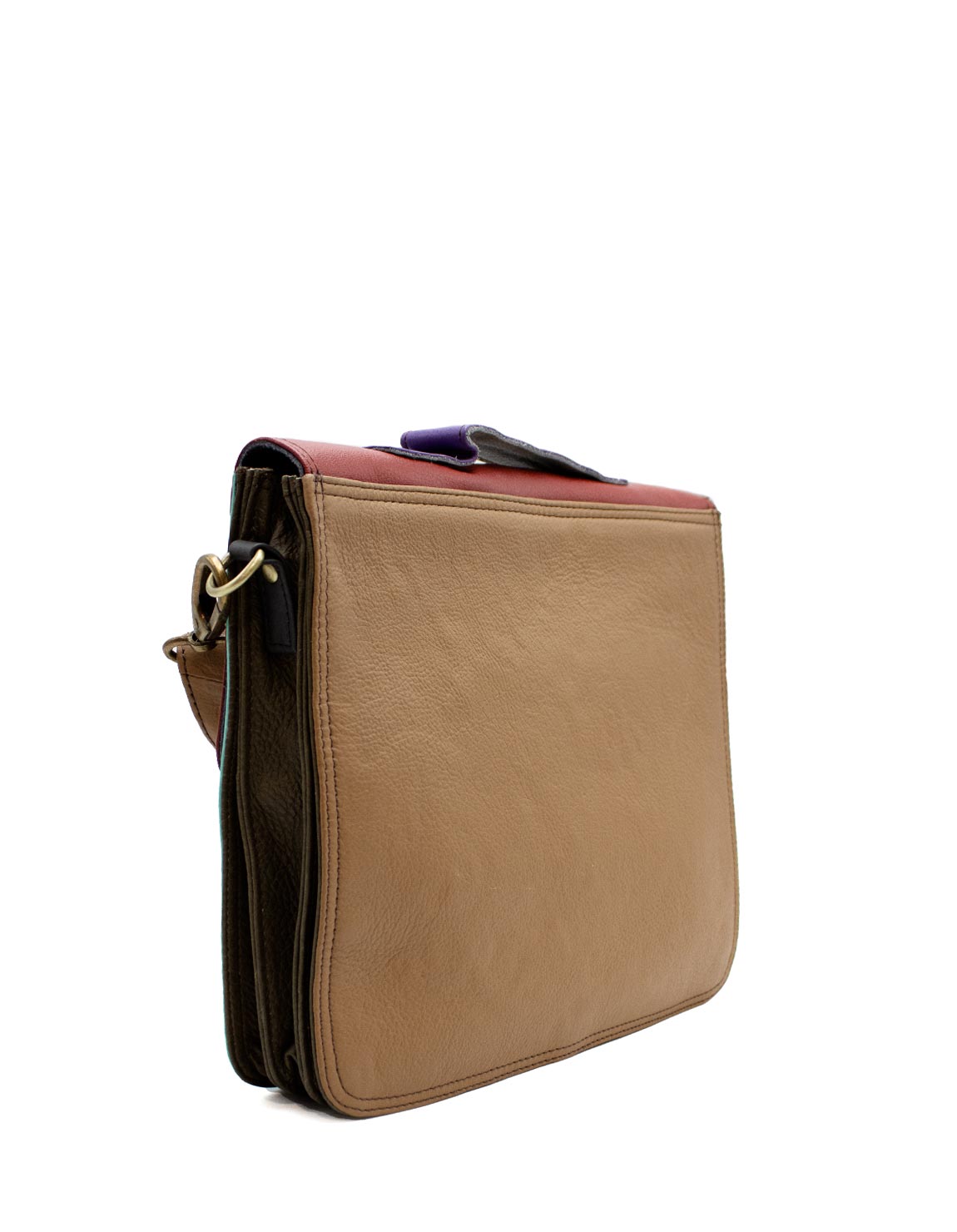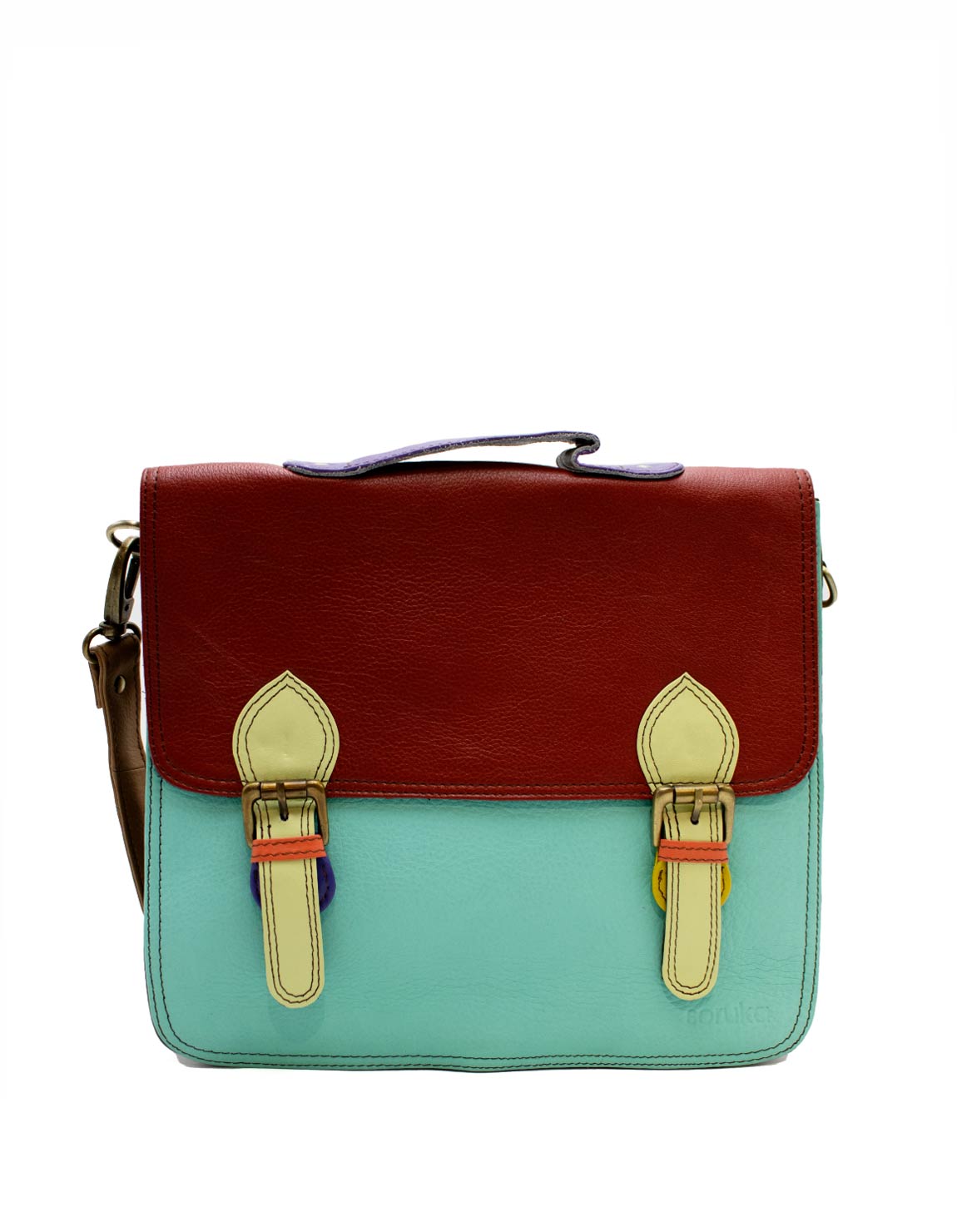 100% Recycled Leather Briefcase in shades of Red and Blue. Beautiful Eco-friendly Handmade Messenger Bag with Top Handle.