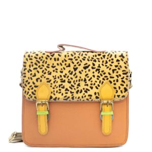 100% Recycled Leather Briefcase in Shades of Light Pink and with Animal print flap. Beautiful Eco-friendly Handmade Messenger Bag with Top Handle.