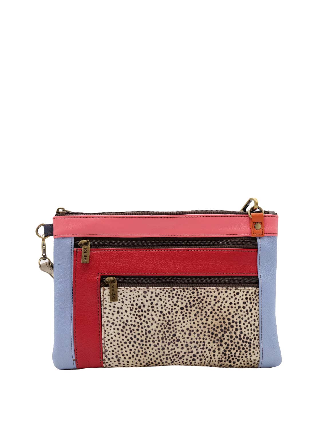 Handmade crossbody bag in shades of red, crafted from 100% recycled leather. Medium-sized, lightweight, and durable, it’s designed for everyday use without taking up much space. It features three zippered compartments to separate your phone, wallet, and keys; plus, a lined interior pocket for small essentials and a quick-access front pocket with an animal print for a distinctive touch. The top closure with a leather pull keeps everything secure, while the adjustable and removable strap allows you to wear it over your shoulder or across your body, depending on the occasion. A unique and sustainable piece that combines practicality and style.