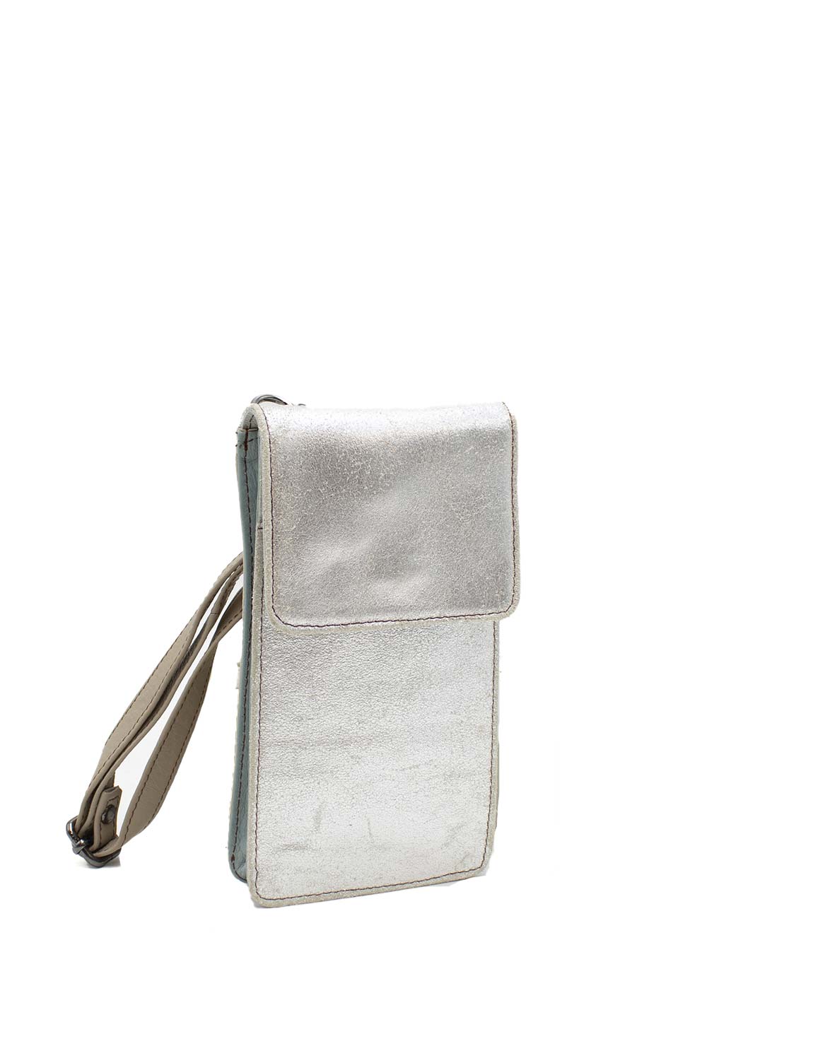 Beautiful 100% Recycled Leather Crossbody Phone Bag. Eco-friendly Handmade Pouch for mobile phones in Shades of Shiny Silver. This glitter phone bag is unique and will make a statement when you wear it.