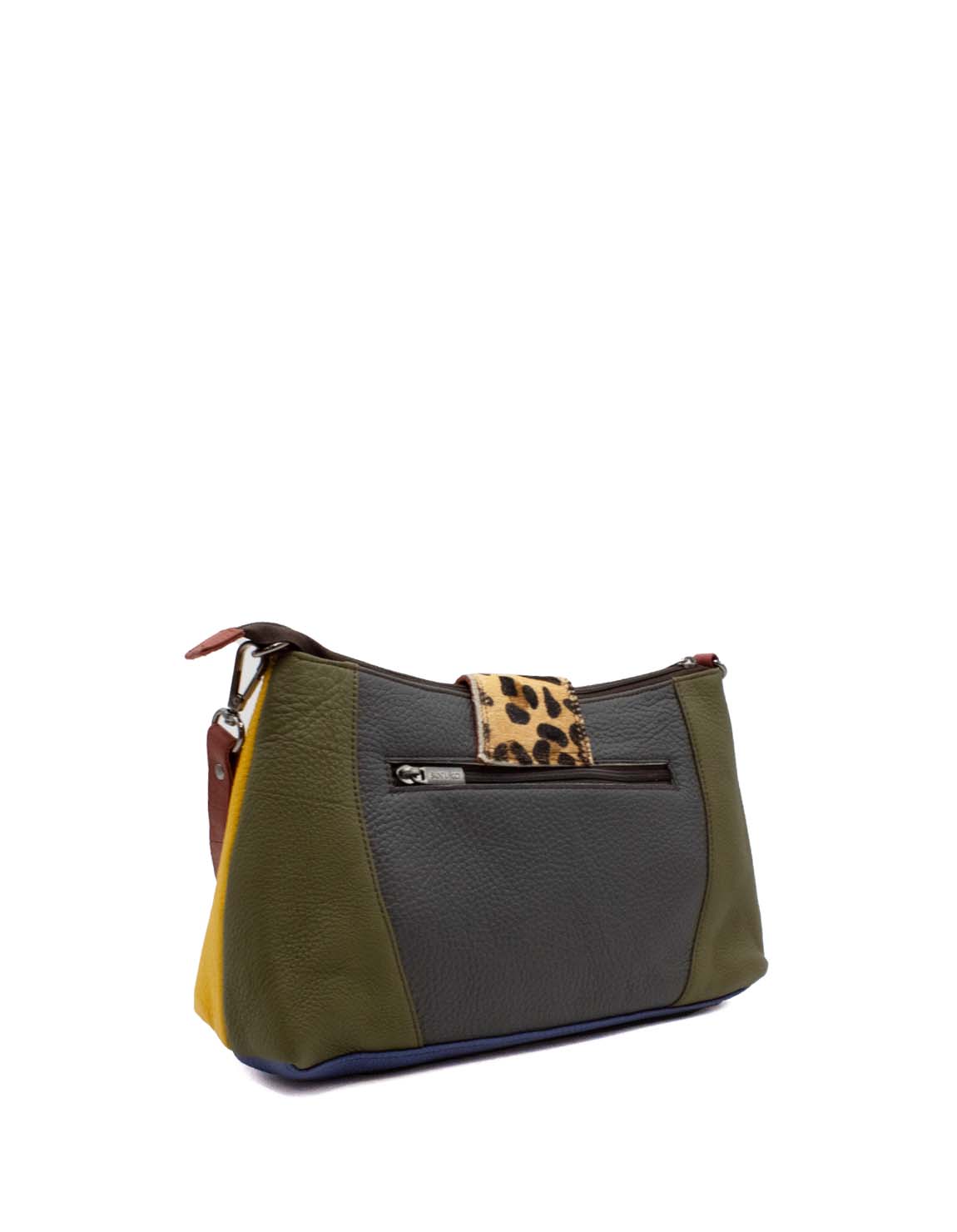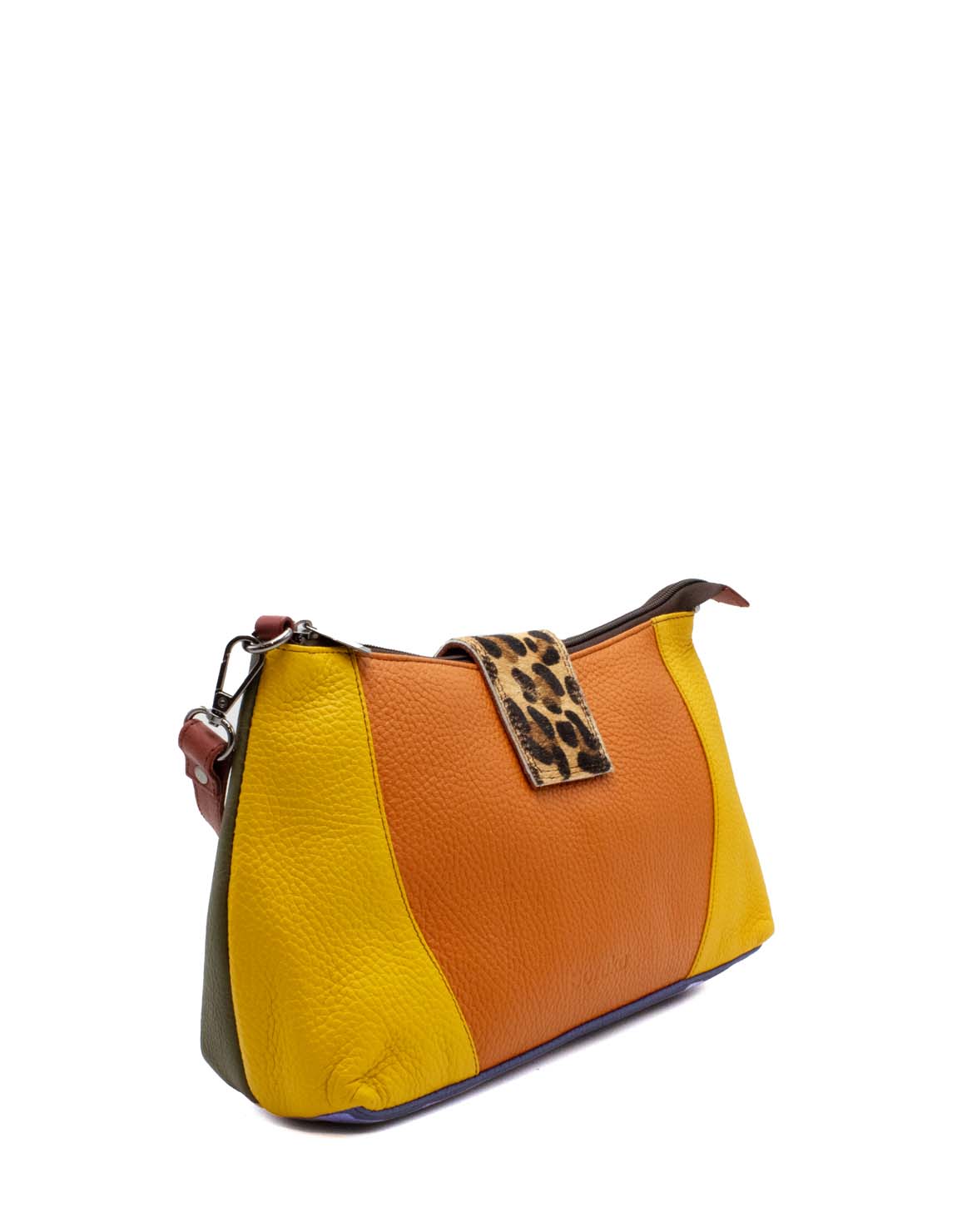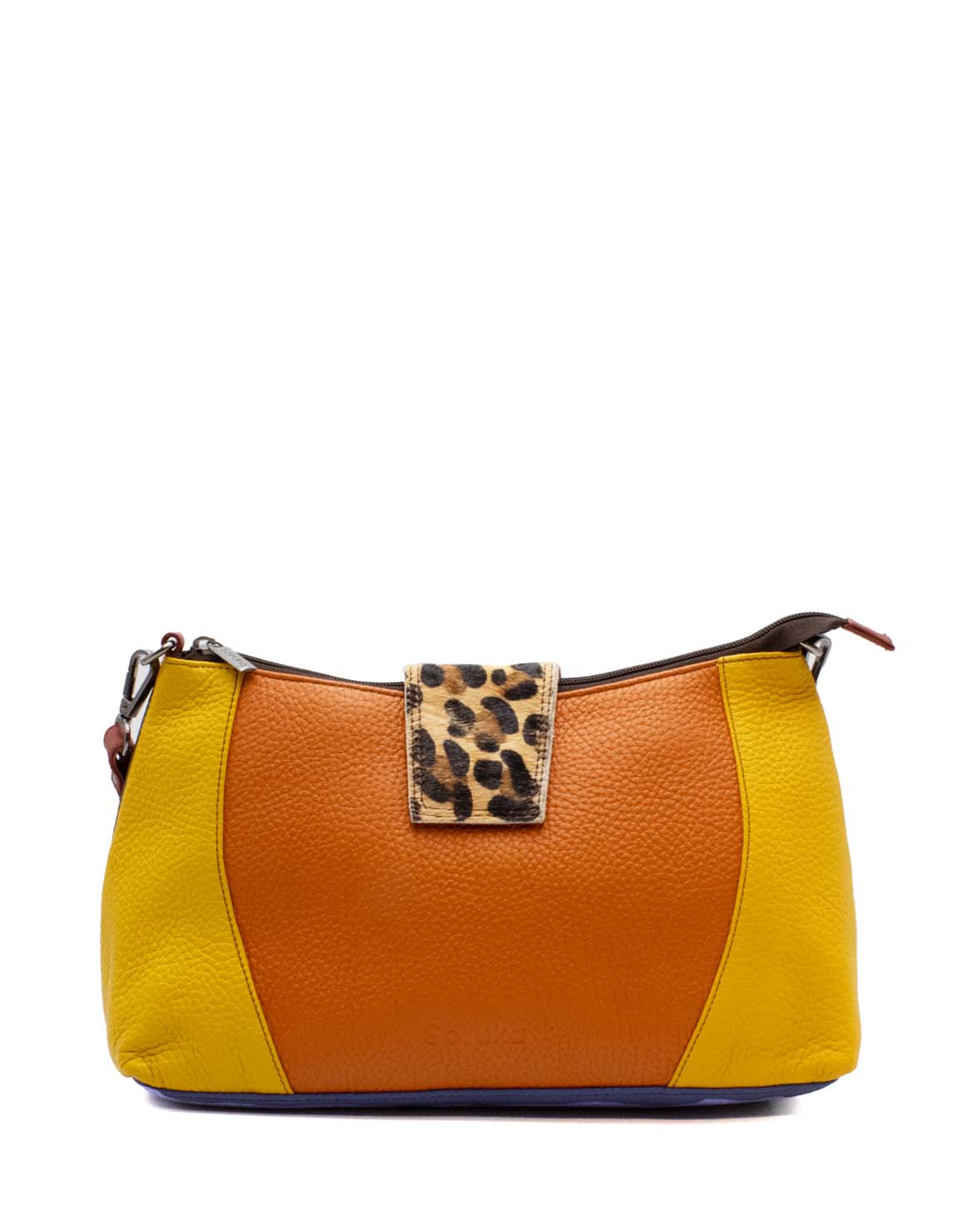 Elegante y sostenible, esta bandolera de tamaño mediano hecha a mano en piel reciclada es la combinación perfecta de elegancia y funcionalidad. Diseñado para llevarlo a diario, presenta una silueta elegante en tonos amarillo y naranja con un toque de atrevido estampado animal para un look llamativo.
