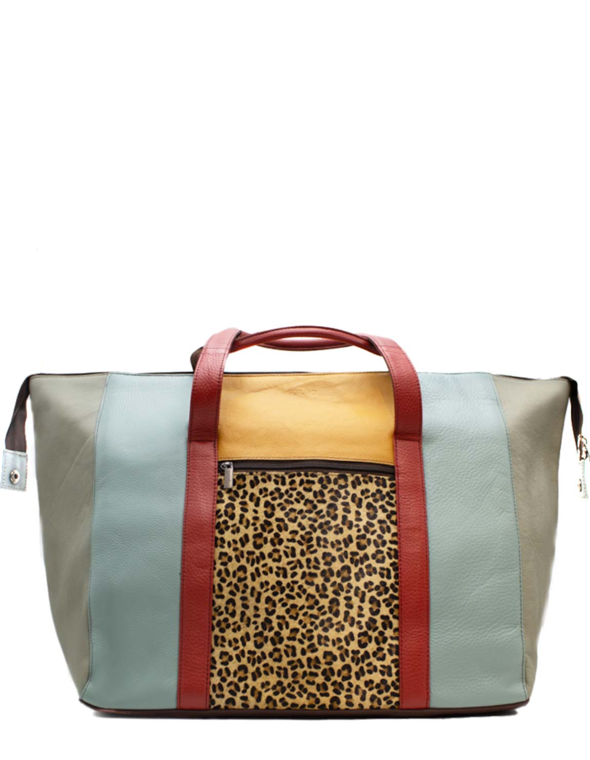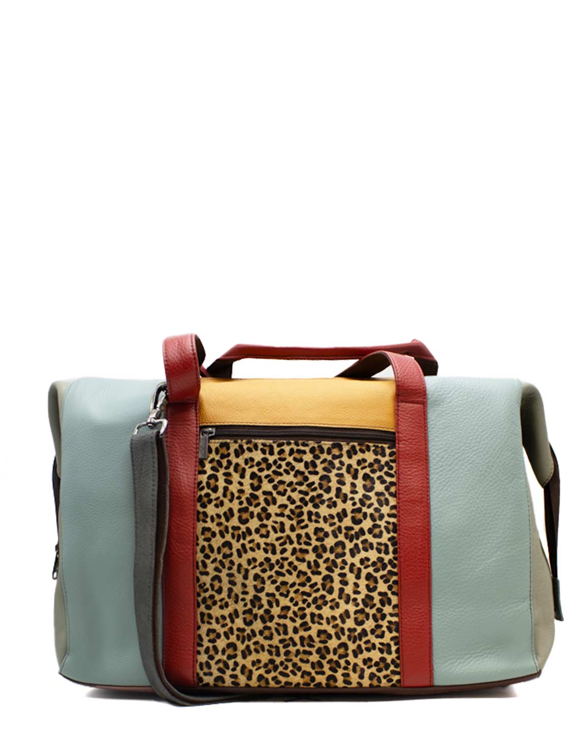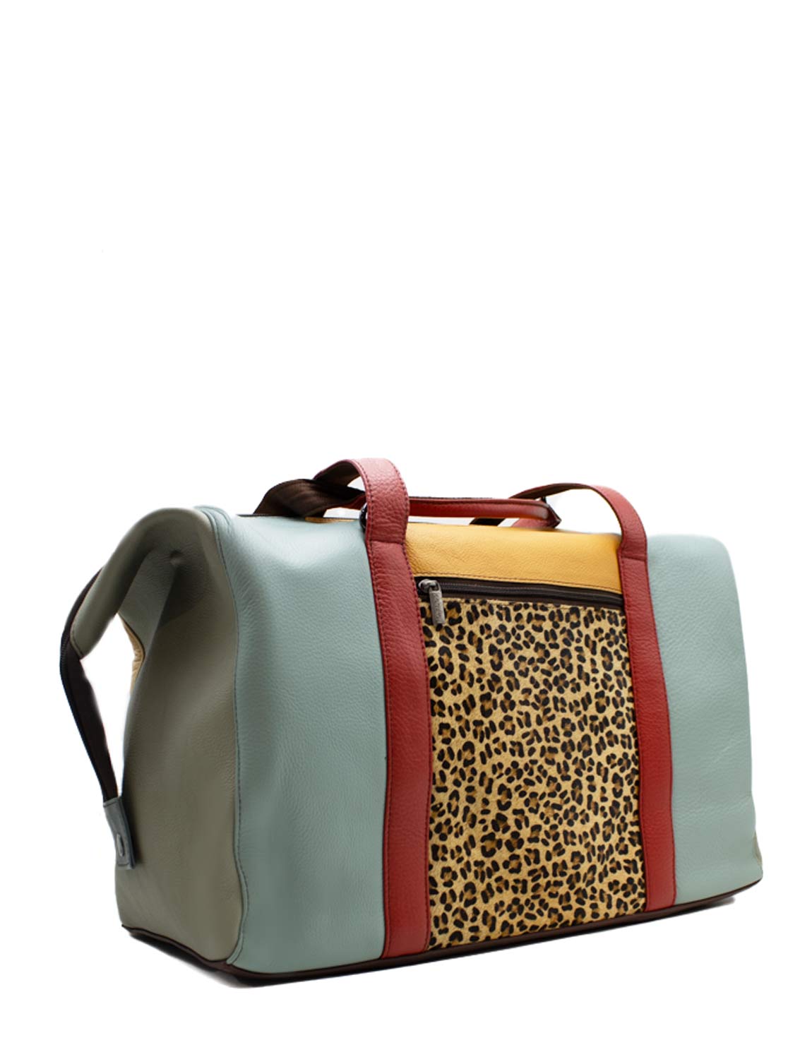 Handmade travel bag crafted from 100% recycled leather with an animal print in shades of blue and yellow.