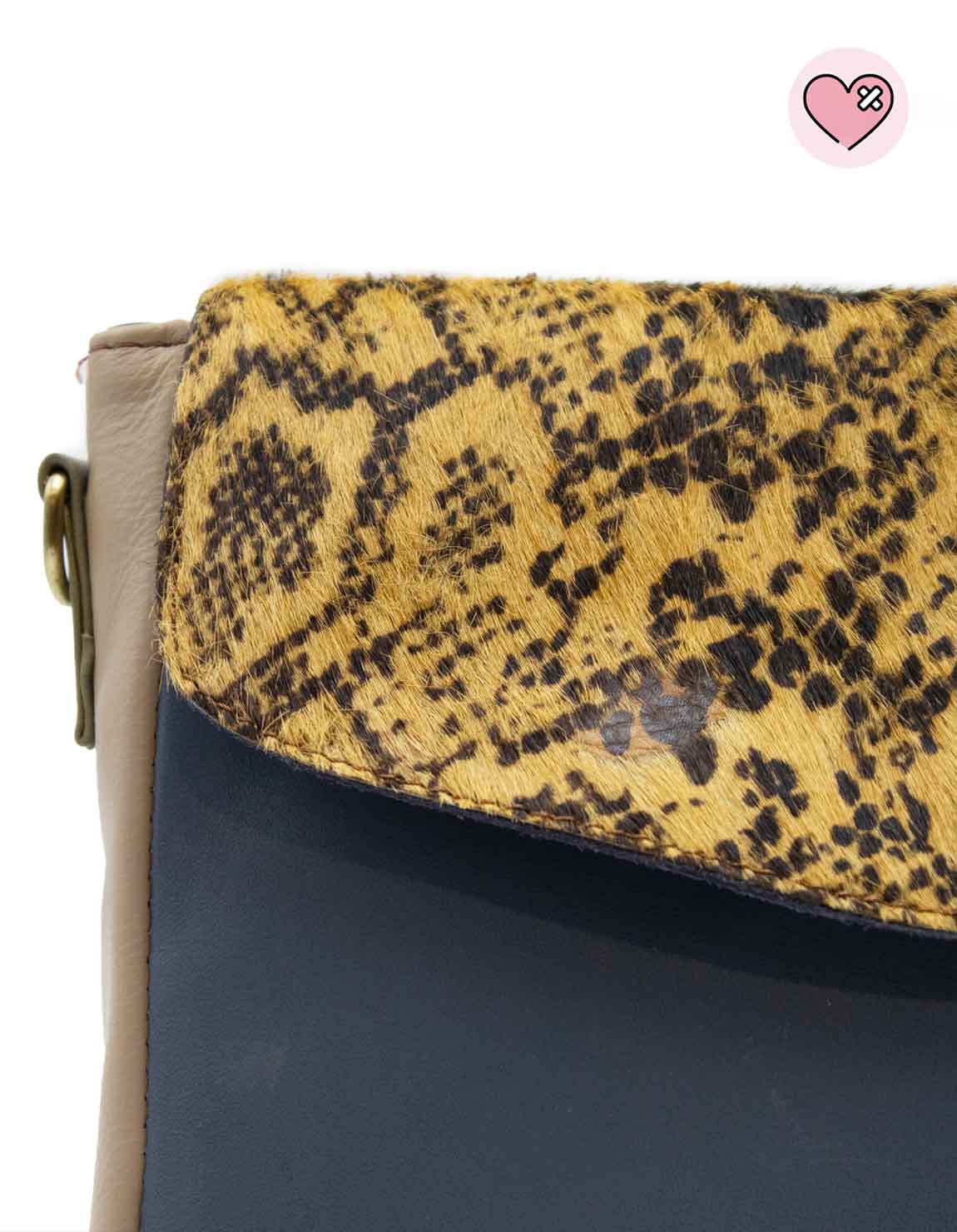 Beautiful 100% Recycled Leather Crossbody Bag with Animal Print and in blue color.