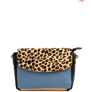 Beautiful 100% Recycled Leather Crossbody Bag with Animal Print and in blue color.