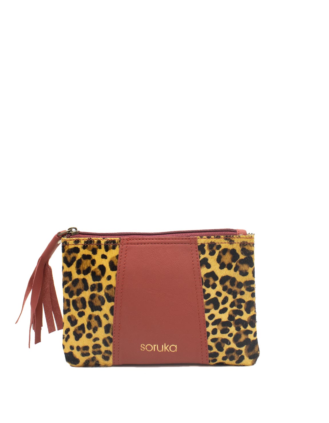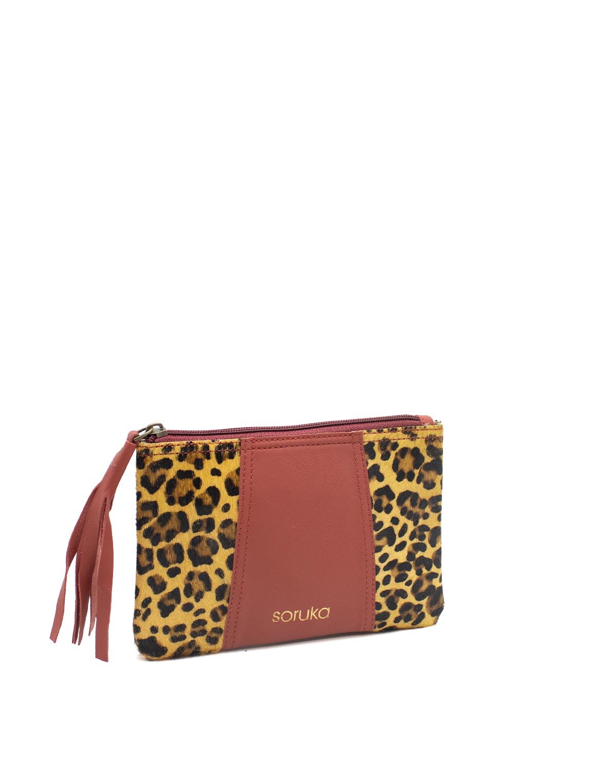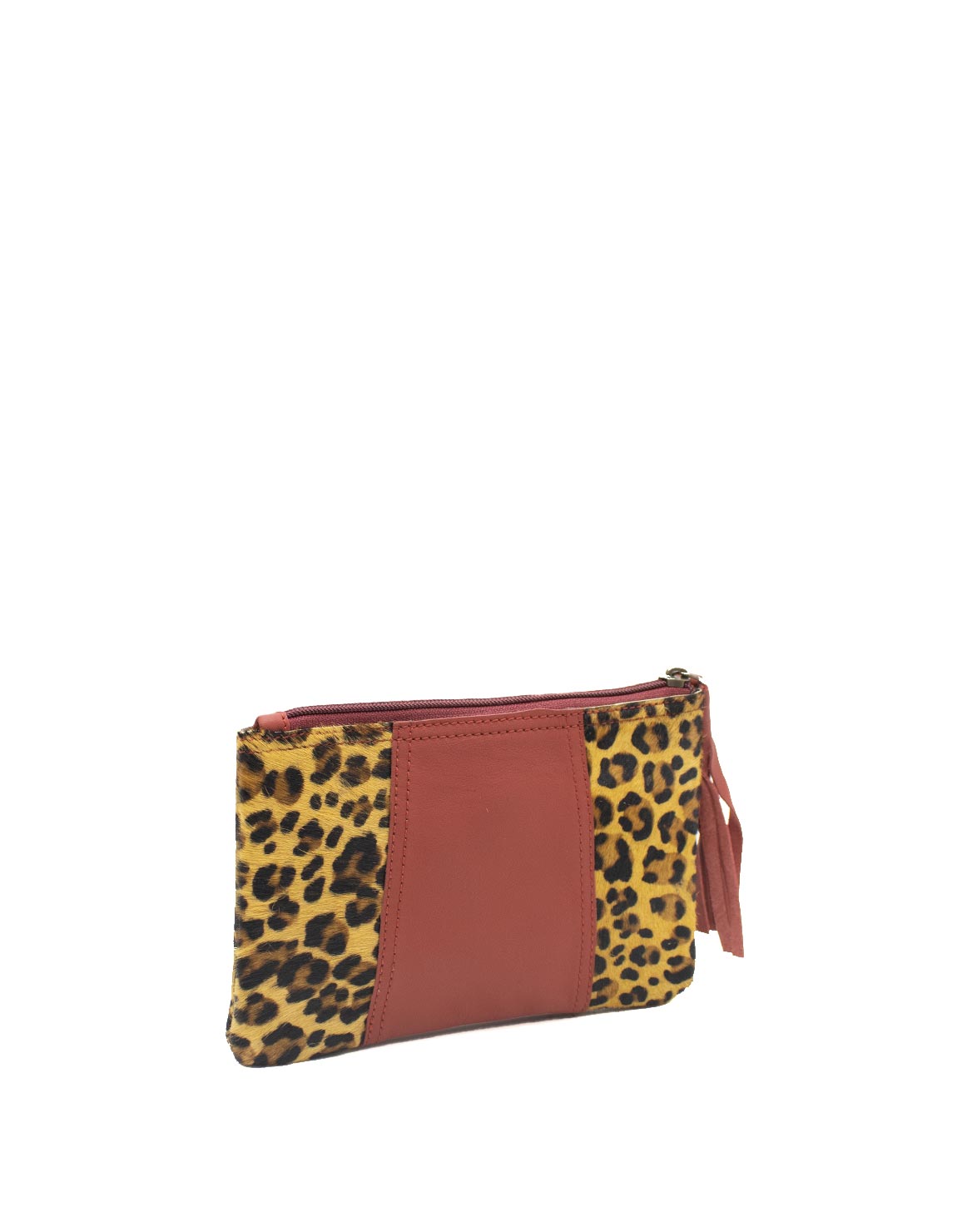 The pouch contains a main department that includes 3 credit card slots and an inside zipper coin pocket. It fastens with a zipper strap with a leather ornament for easy opening.